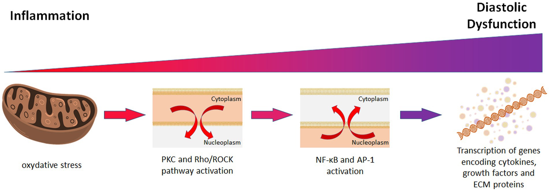 Figure 1. During inflammatory response, in the mytochondrial environment, oxidative stress activates PKC and Rho/ROCK pathway, subsequently triggering cellular NF-κB and AP-1, which drive inflammatory cascades. Thus, contributes to the development of coronary vasospasm, hypertension, and myocardial remodeling, ultimately resulting in diastolic dysfunction. PKC, protein kinase C; NF-κB, nuclear factor kappa light chain of B cells; AP-1, activator protein-1; ECM, extracellular matrix.