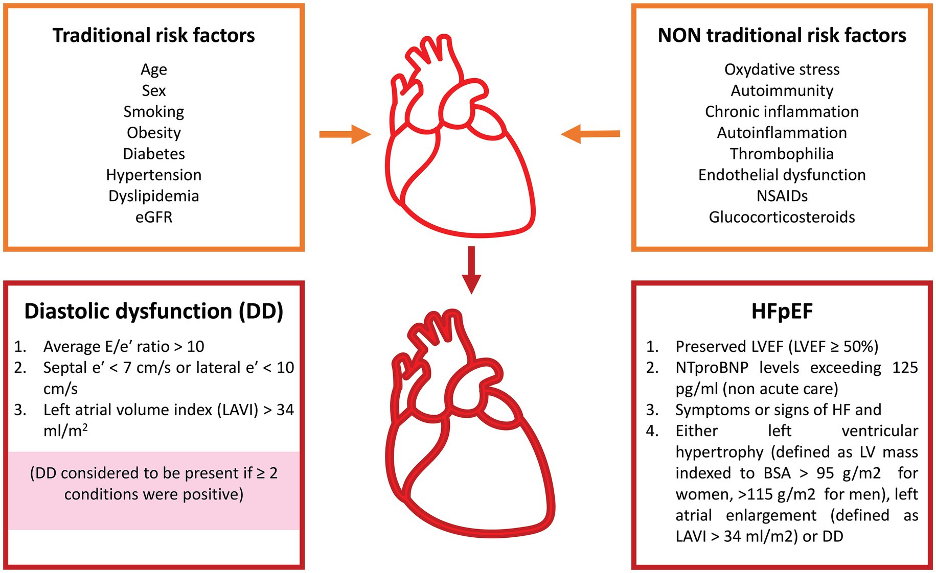 Observations: Patients with autoimmune diseases such as rheumatoid arthritis (RA), systemic lupus erythematosus (SLE), and systemic sclerosis (SSc) exhibit an increased risk of developing HFpEF, often through mechanisms involving chronic inflammation and endothelial dysfunction, which precede the clinical manifestation of HFpEF. Clinical studies have demonstrated that the risk of developing HFpEF exists independently of traditional cardiovascular risk factors, underscoring the pivotal role of chronic inflammation and autoimmunity as key contributors to its pathogenesis.