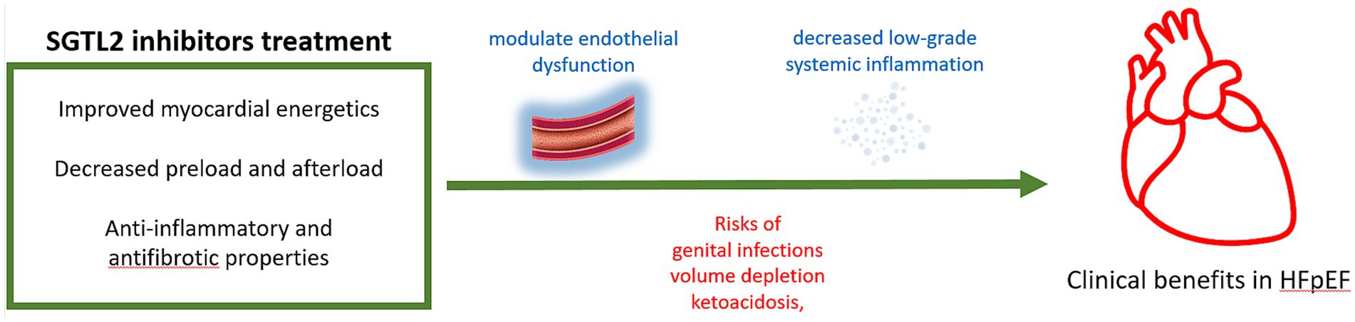 Figure 3. SGLT2 inhibitors have demonstrated clinical benefits in HFpEF, reducing the risk of heart failure hospitalization and cardiovascular death by modulating endothelial dysfunction and low-grade systemic inflammation, leading to improve myocardial energetics, decrease preload and afterload, and thought anti-inflammatory and antifibrotic properties. Nonetheless, adverse effects include genital infections, volume depletion, and ketoacidosis. SGLT2, sodium-glucose cotransporter 2; HFpEF, heart failure with preserved ejection fraction.
