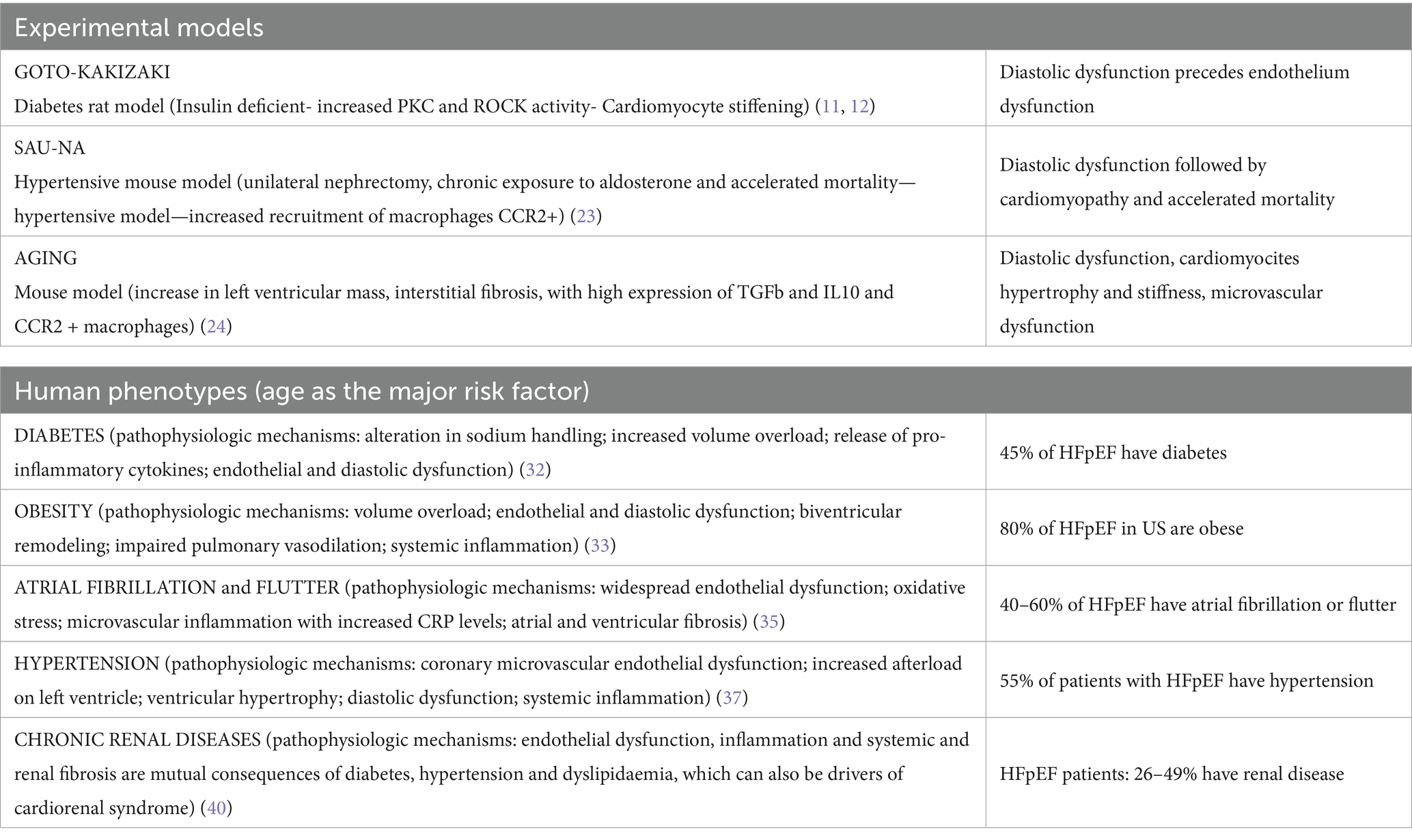 Table 1. Experimental models and in vivo human phenotypes of endothelial and diastolic dysfunction ending up to HFpEF.