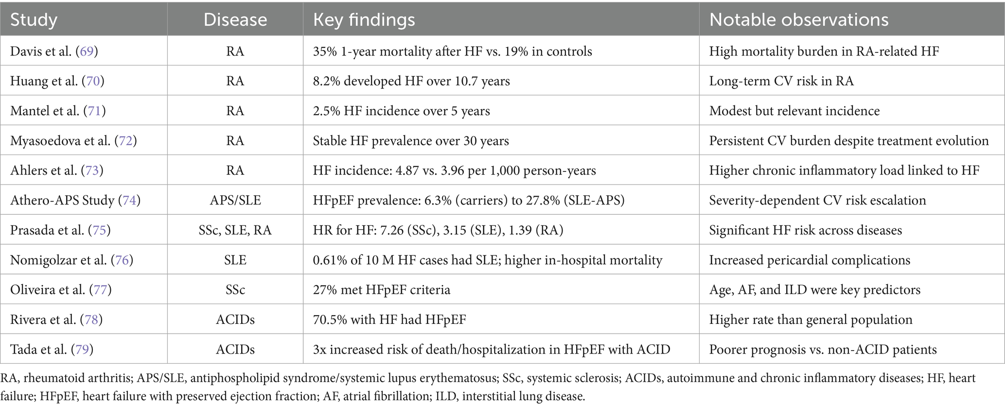 While DD and ED are well-documented in autoimmune diseases, the clinical burden of HFpEF is only recently emerging as a distinct phenotype. Multiple studies from 2008 to 2024 have demonstrated that HFpEF is the dominant HF subtype in these populations (69–73) (Table 2). In RA, one-year mortality after HF diagnosis was 35%, compared to 19% in controls (69), and incidence ranged from 2.5 to 8.2% across cohorts (70–72). These risks remained stable over decades and were linked to disease activity.