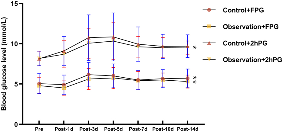 In the control group, blood glucose monitoring was performed using Roche conventional finger blood collection (ACCUCHEK® Performa, Roche, Shanghai, China) and in the observation group, blood glucose monitoring was performed using FGM (FreeStyle Liber HAbbott, Shanghai, China). Blood glucose monitoring was performed from the day of surgery to 15 days after surgery, on a fasting basis and 2 h after three meals. Patients should be monitored at any time in case of abnormal blood glucose. All patients had pre-operative glycated hemoglobin measured by venous blood, with normal values ranging from 3.6 to 6.0% and a diagnosis of diabetes when ≥6.5%.