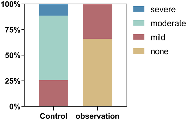 Compared to patients using traditional finger blood collection for monitoring blood glucose (control group), patients using FGM (observation group) experienced less pain during blood glucose monitoring (P < 0.05) according to NRS. In the observation group, 35 patients (66.04%) reported no pain and 18 patients (33.96%) reported mild pain. However, in the control group all patients reported pain. Of these, 16 (25.81%) patients reported mild pain, 39 (62.9%) patients reported severe pain and 7 (11.29%) patients reported severe pain (Figure 2).