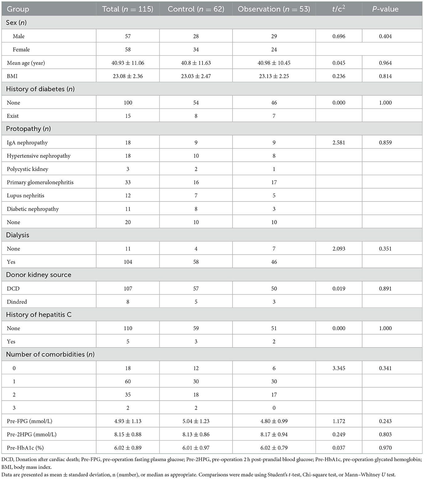 The clinical data of the 115 patients, such as sex, age, Body Mass Index (BMI), family history of diabetes mellitus, dialysis history, primary disease, donor kidney source, history of hepatitis C, number of comorbidities, fasting plasma glucose (FPG), 2 h post-prandial blood glucose (2hPG), pre-operative glycated hemoglobin (HbA1c), pain levels, glucose monitoring system satisfaction, abnormal blood sugar events, and adverse events were all collected.