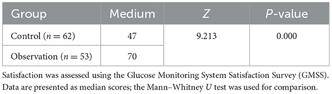 As shown in Table 2, patients in the observation group were more satisfied with the blood glucose monitoring equipment than the control group according to GMSS. The median score for patients in the observation group was 70, compared to 47 for the control group. Statistically significant difference in satisfaction with blood glucose monitoring equipment between the two groups (P < 0.05). Informal qualitative feedback from patients in the FGM group frequently cited “reduced pain,” “convenience,” and “a feeling of better glucose control” as key reasons for their higher satisfaction.