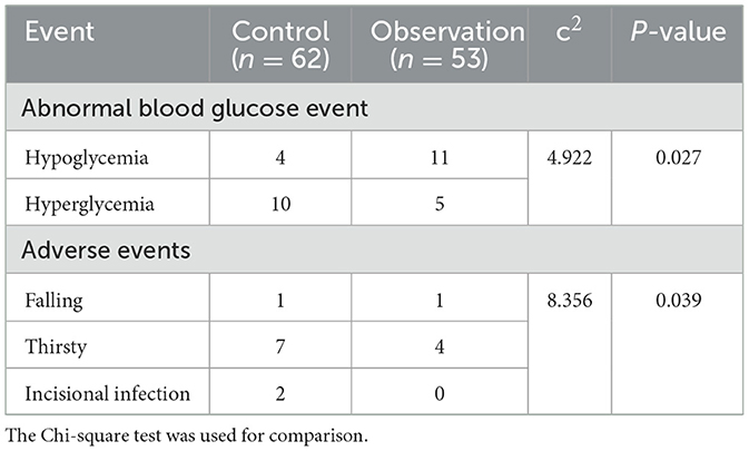The American Diabetes Association guidelines (26) for abnormal blood sugar were used to define abnormal blood glucose events. Hypoglycemia is defined when blood sugar is ≤ 3.9 mmol/L or 70 mg/dL, and hyperglycemia is defined when blood sugar is ≥10 mmol/L or 180 mg/dL. The occurrence of adverse events was mainly recorded according to the main complaint or actual occurrence of patients, including falls, polydipsia, wound infection, etc.