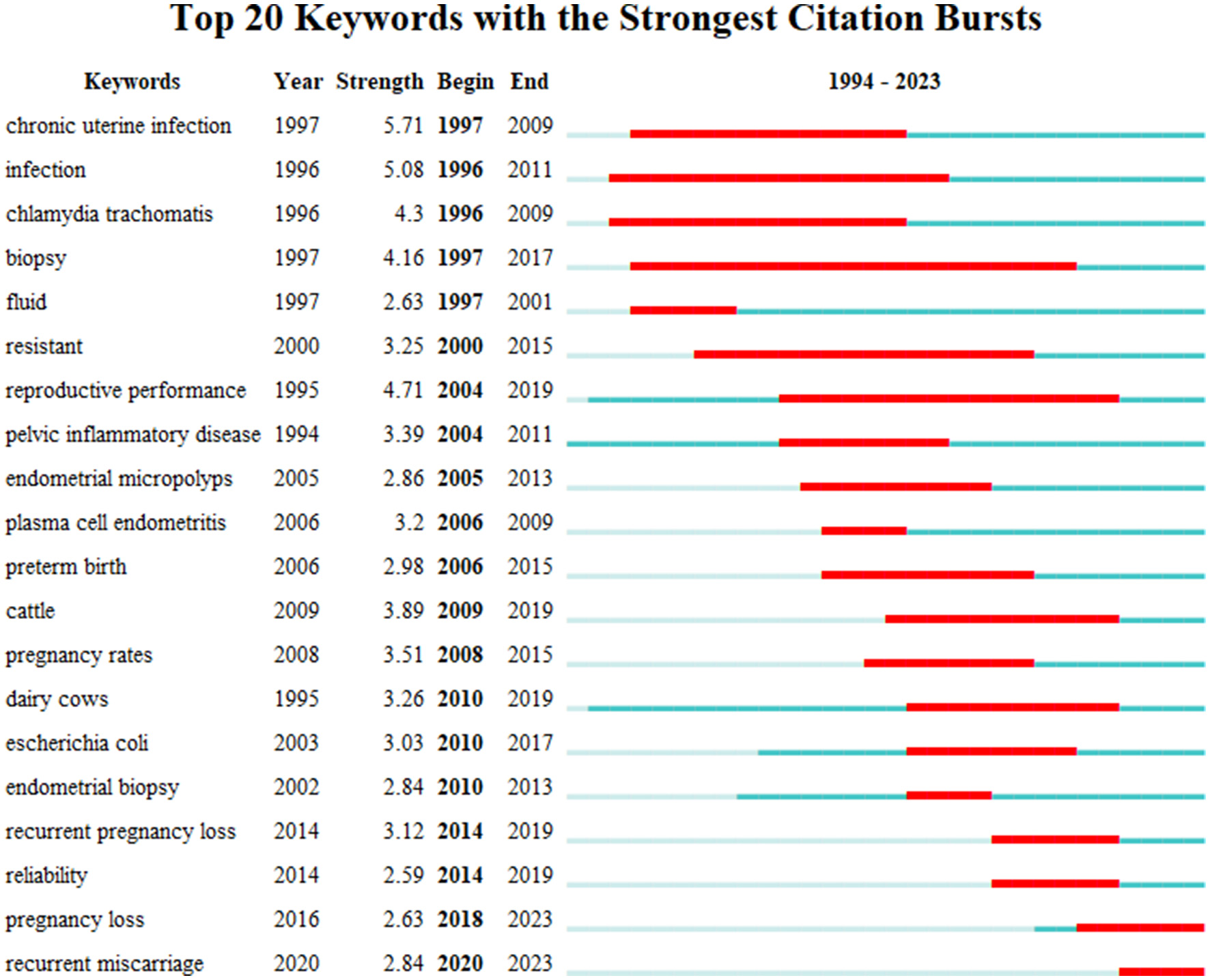 A total of 373 publications on CE were retrieved. Annual publication of articles about CE grew rapidly, and 2022 had the biggest outputs (50). USA contributed the most publications (87), and the University of Bari Aldo Moro had the highest number of articles in this field (27). The journal with the highest cited count and most publications was Fertility and Sterility (30). The main disciplines concerning the research on CE were Obstetrics Gynecology (141, 38.11%) and Reproductive Biology (126, 34.05%). Ettore Cicinelli, Kotaro Kitaya, and Dominique De Ziegler were the top three authors in publications. Except for CE and endometritis, the five most common keywords were infertility, hysteroscopy, plasma cell, recurrent implantation failure, and CD138. Pregnancy loss and recurrent miscarriage are currently within the burst period and might be the persistent research heated topics in this field.