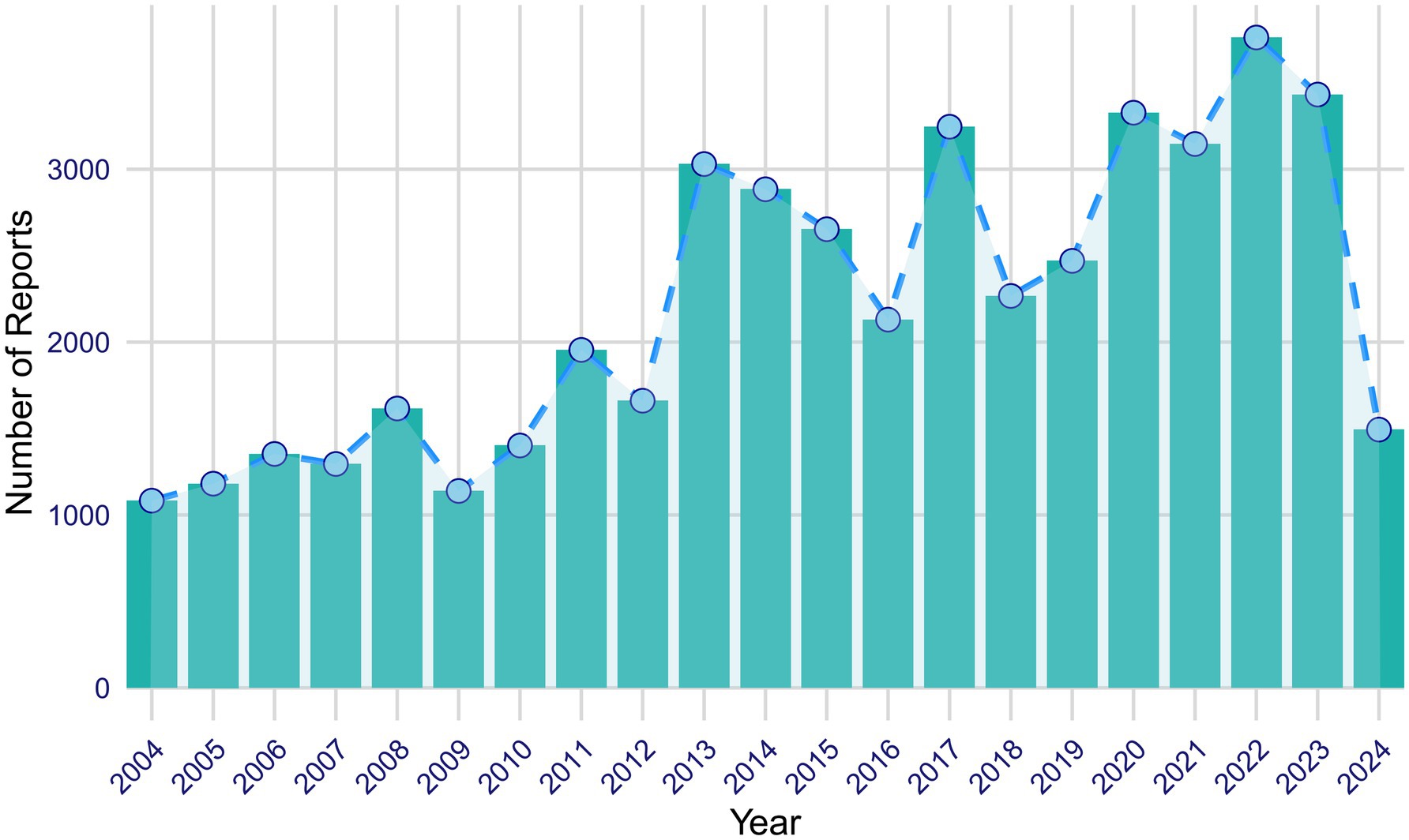 The analysis starts in 2004 because FAERS data became available from that time. This ensures the inclusion of both early and recent adverse event reports, which gives a more complete picture of isotretinoin’s safety profile. Additionally, this time period allows for consistent application of the FDA’s data cleaning and deduplication procedures, ensuring the robustness of our findings.