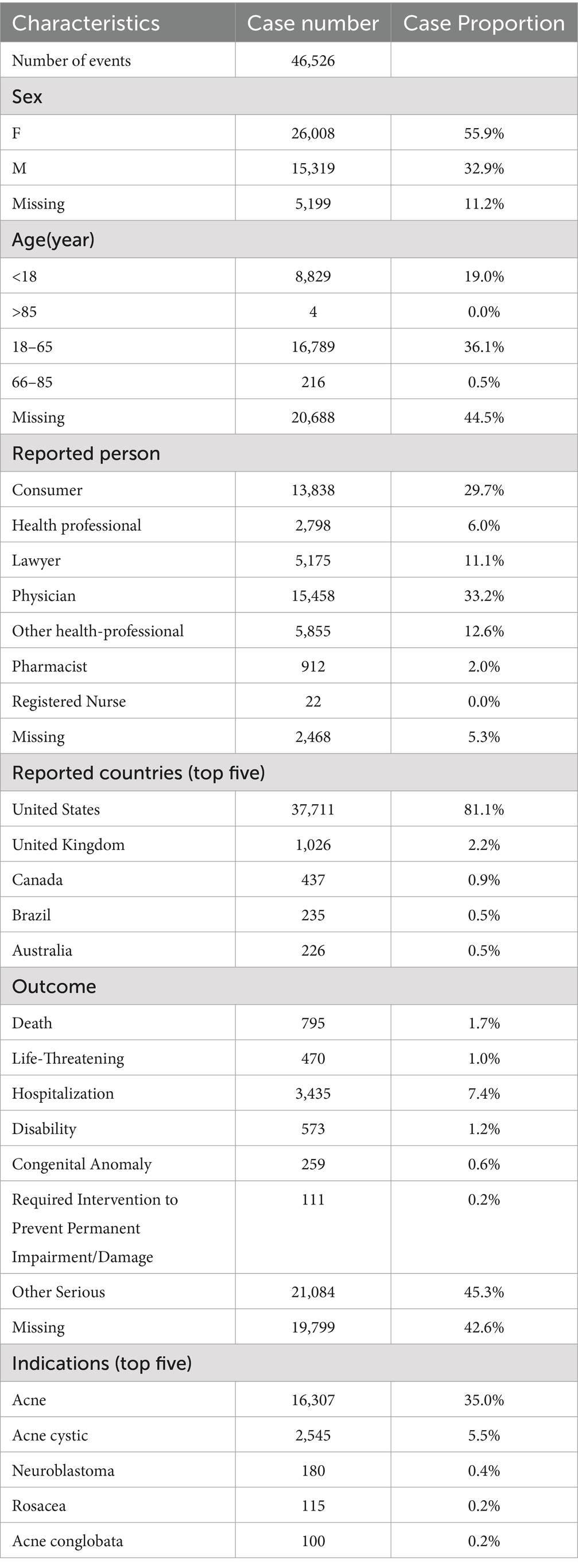 Citation: Yang L, Xie H, Jia Y, Cui B and Xiao Z (2025) Mining and analysis of adverse event signals of isotretinoin based on the real-world data of FAERS database. Front. Med. 12:1559972. doi: 10.3389/fmed.2025.1559972