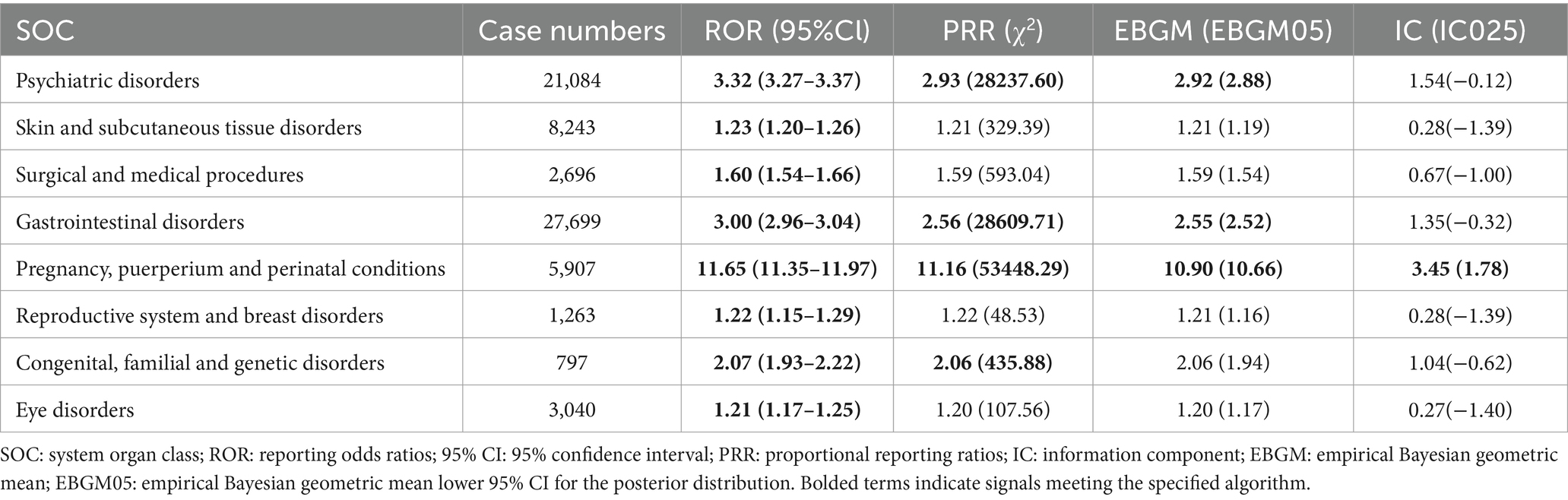 The significance of the signals was determined using specific thresholds for each statistical method. For ROR, a lower limit of 95% confidence interval (CI) > 1 and a count of at least 3 reports were considered significant. For PRR, the criteria were PRR ≥ 2, χ2 ≥ 4, and a minimum of 3 reports. In BCPNN, a Interval Confidence 025 (IC025) > 0 was used, and for EBGM, a threshold of EBGM≥2 was applied. These thresholds were chosen to minimize false positives while ensuring the reliability of the results.