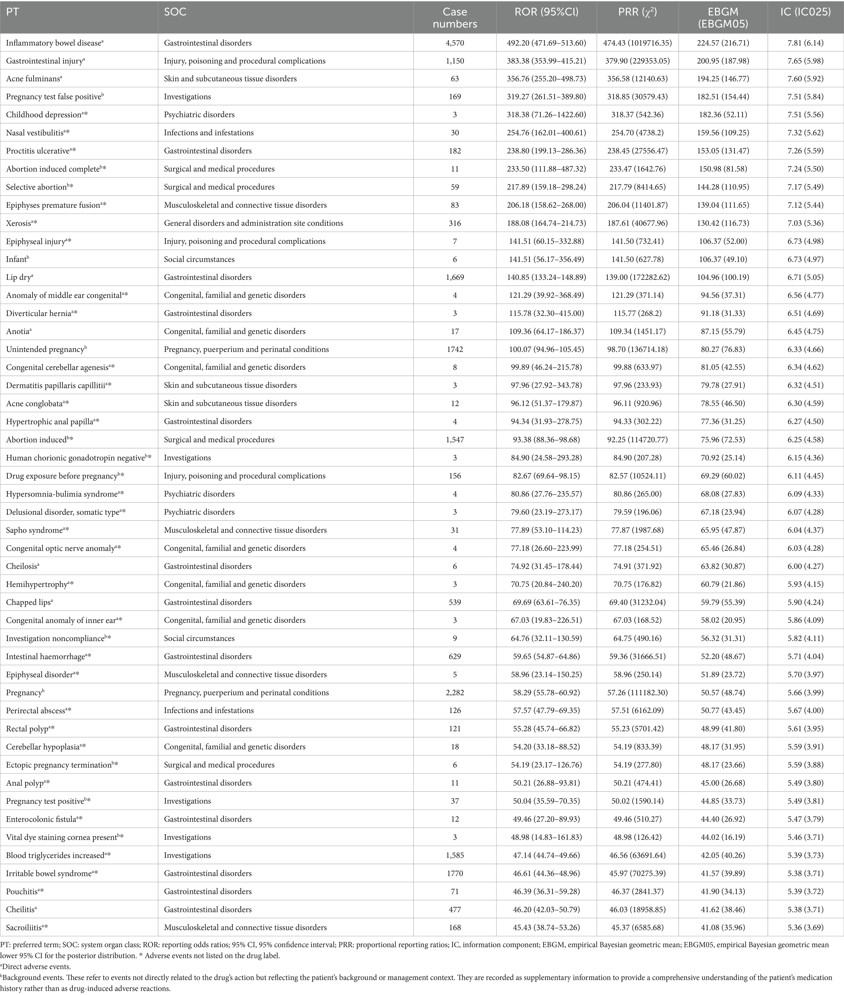 In addition to teratogenic risks, our study identified “Gastrointestinal Disorders” as the most frequently reported SOC, including AEs such as IBD, ulcerative proctitis, dry lips, intestinal bleeding, and anal polyps. Evidence suggests that ISO may trigger IBD through mechanisms like mucosal barrier disruption, altered gut microbiota, and immune dysregulation mediated by cytokines such as IL-17 and TNF-α (27, 28). While the link between ISO and IBD remains debated, with some attributing IBD to underlying patient susceptibility, growing data support a potential association that warrants further investigation (29, 30). ISO may induce IBD through multiple mechanisms. It can disrupt intestinal immune balance by inhibiting epithelial cell growth and T cell activation (31). Additionally, ISO-activated T cells express α4β7 and CCR9 receptors, which are crucial in gastrointestinal inflammation. ISO also affects neutrophil chemotaxis and reactive oxygen species production, exacerbating intestinal inflammation (28). Furthermore, ISO’s impact on lipid profiles, particularly HDL, may promote monocyte activation and further amplify inflammatory responses (32). Although ISO may promote IBD by damaging the intestinal barrier, retinoic acid (a form of ISO) has been shown to enhance the expression of tight junction proteins, such as occludin, claudin-1, claudin-4, and zonula occludens-1, thereby improving intestinal barrier function and potentially mitigating IBD progression (33). Therefore, ISO’s role in IBD is complex, with the potential to both exacerbate inflammation and, under certain conditions, protect the intestinal barrier (34). Therefore, while the role of ISO in IBD remains unclear, its dual potential to exacerbate or protect the intestinal barrier highlights the need for further research to clarify the mechanisms involved. The FAERS classification of symptoms such as cheilitis and cracked lips under “Gastrointestinal Disorders” illustrates the diverse pathways through which ISO induces AEs. These symptoms may result from local mucosal effects or immune-driven gastrointestinal conditions like IBD. This classification reflects the systemic reach of ISO’s effects, emphasizing the importance of monitoring its impact beyond its traditional focus on skin and mucosal tissues.