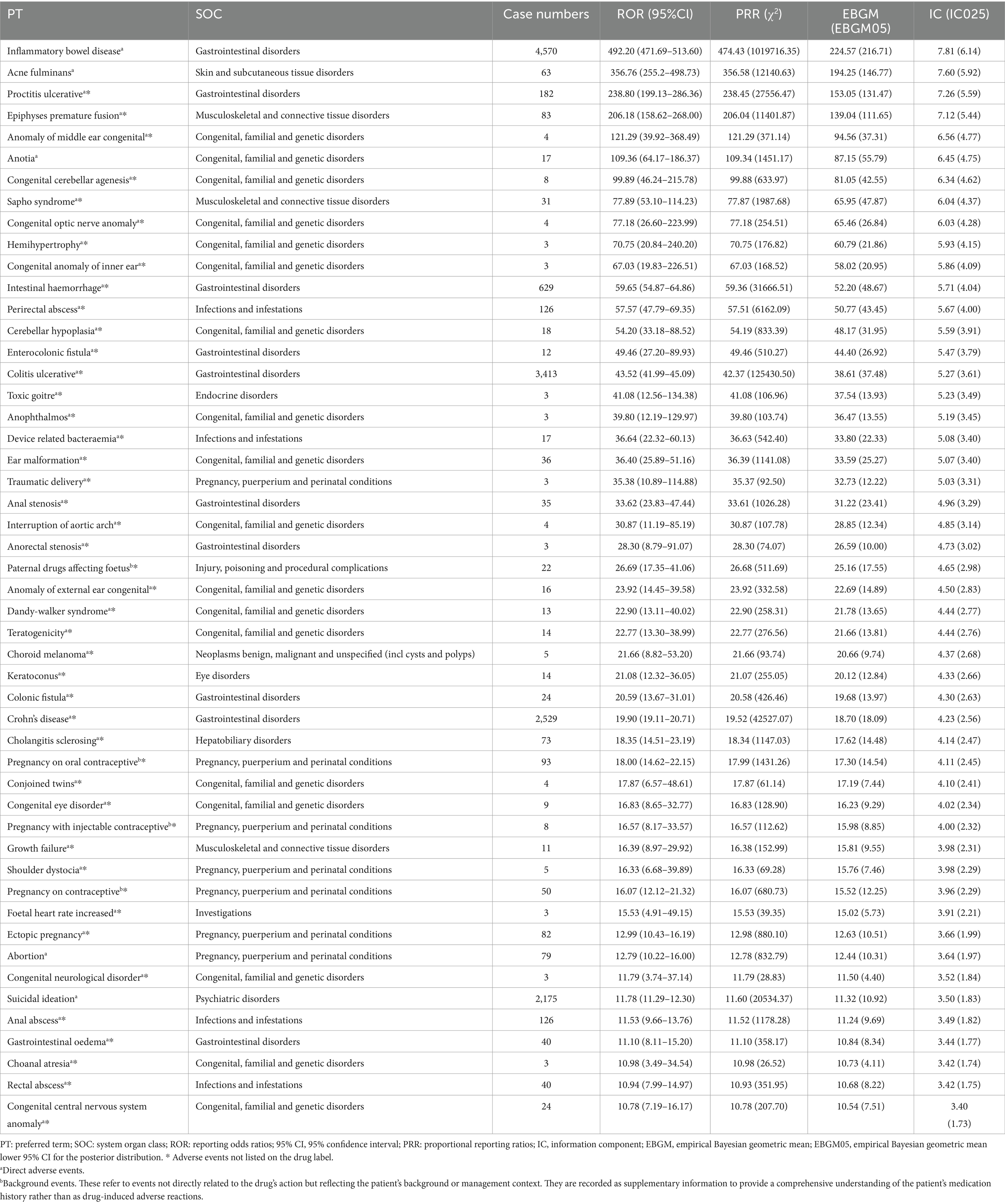 At the PT level, 445 AEs demonstrated significant signals across all four algorithms, spanning 26 SOCs. The five most frequently reported PTs were IBD (N = 4,570), Irritable Bowel Syndrome (N = 1,770), Dry Lips (N = 1,669), Elevated Blood Triglycerides (N = 1,585), and Gastrointestinal Injury (N = 1,150). Of these, IBD, dry lips, and gastrointestinal injury were included in ISO’s drug label. The ten PTs with the strongest signal strengths were IBD (ROR: 492.20), Gastrointestinal Injury (ROR: 383.38), Acne fulminans (ROR: 356.76), Childhood Depression (ROR: 318.38), Nasal Vestibulitis (ROR: 254.76), Ulcerative Proctitis (ROR: 238.80), Premature Epiphyseal Closure (ROR: 206.18), Sicca Syndrome (ROR: 188.08), Epiphyseal Plate Injury (ROR: 141.51), and Cracked Lips (ROR: 140.85). Notably, only three of these ten signals—IBD, gastrointestinal injury, and acne fulminans—were included on the drug label.