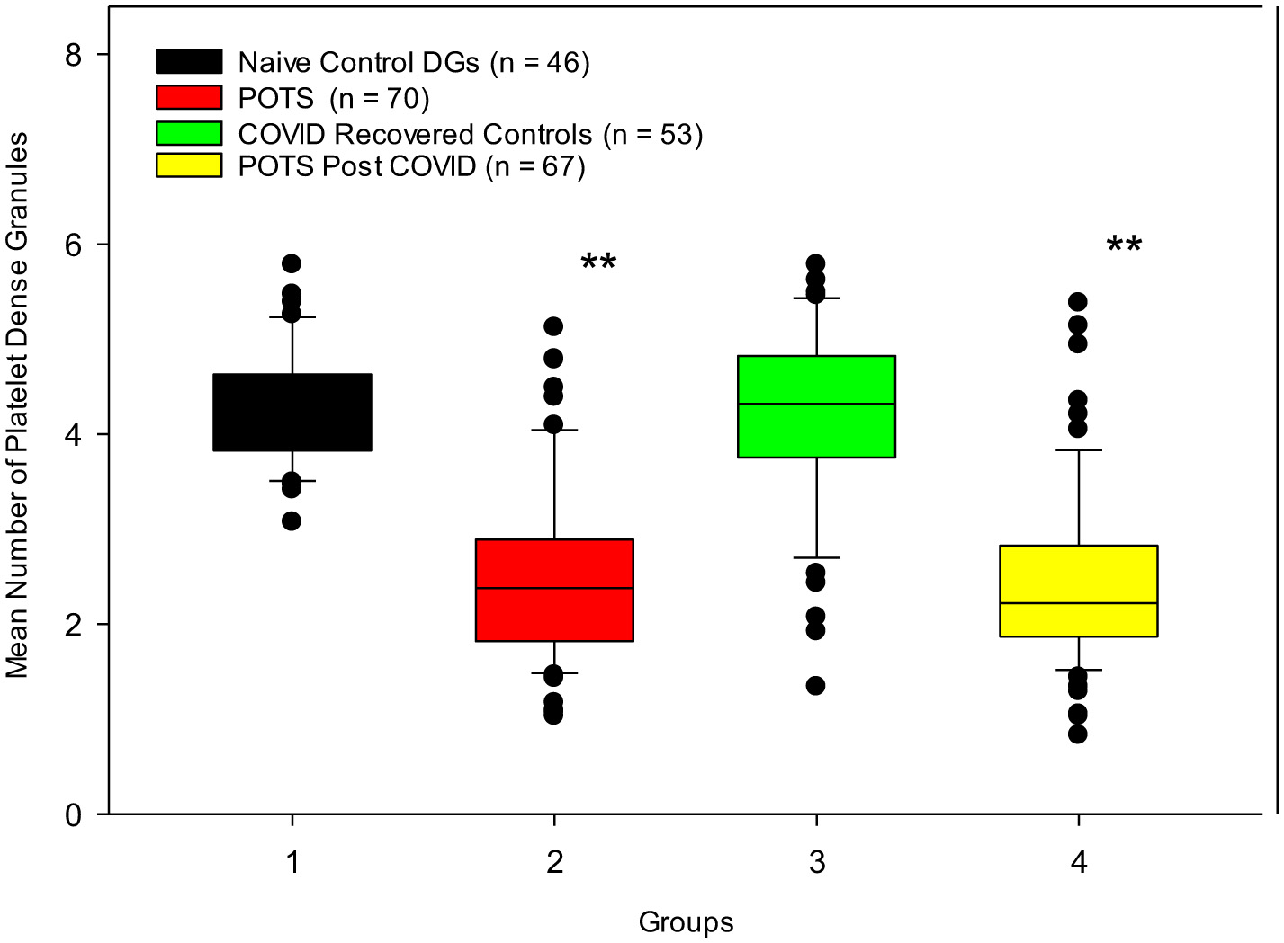 Control subjects who were naïve to COVID-19 infection and those who contracted COVID-19 infection but recovered healthily have normal numbers of dense granules, in contrast to POTS patients diagnosed prior to the pandemic and patients who developed POTS post-COVID-19 infection. **p < 0.001 for both POTS groups vs. control groups.
