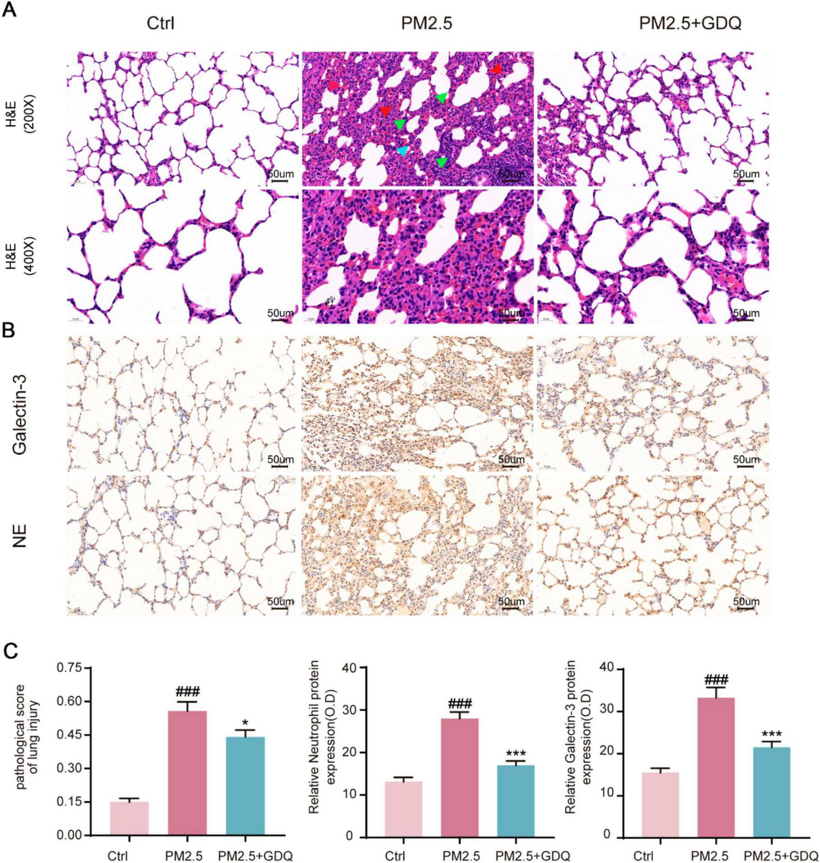 GDQ attenuates lung tissue damage induced by PM2.5. (A) HE staining of lung tissue in each group. (The first row of Figure 3A: magnification 200 ×, Scale bar = 50 μm, The second row of Figure 3A: magnification 400 ×, Scale bar = 50 μm). Arrows indicate classical lung injury. The blue, red and green arrows indicate inflammatory cell infiltration, hyperaemia, and thickening of the alveolar walls, respectively. (B) Immunohistochemical staining (magnification × 200) was used to observe the effect of GDQ on neutrophil and galectin-3 expression in lung tissue of PM2.5 induced lung injury in rats. (C) Statistical plots of semiquantitative histological scores and positive expression of neutrophils and galectin-3 assessed for lung injury induced by PM2.5. Data are presented as mean ± SEM (n = 7). ###p < 0.001, compared to control group. * p < 0.05, *** p < 0.001compared to PM2.5 group.