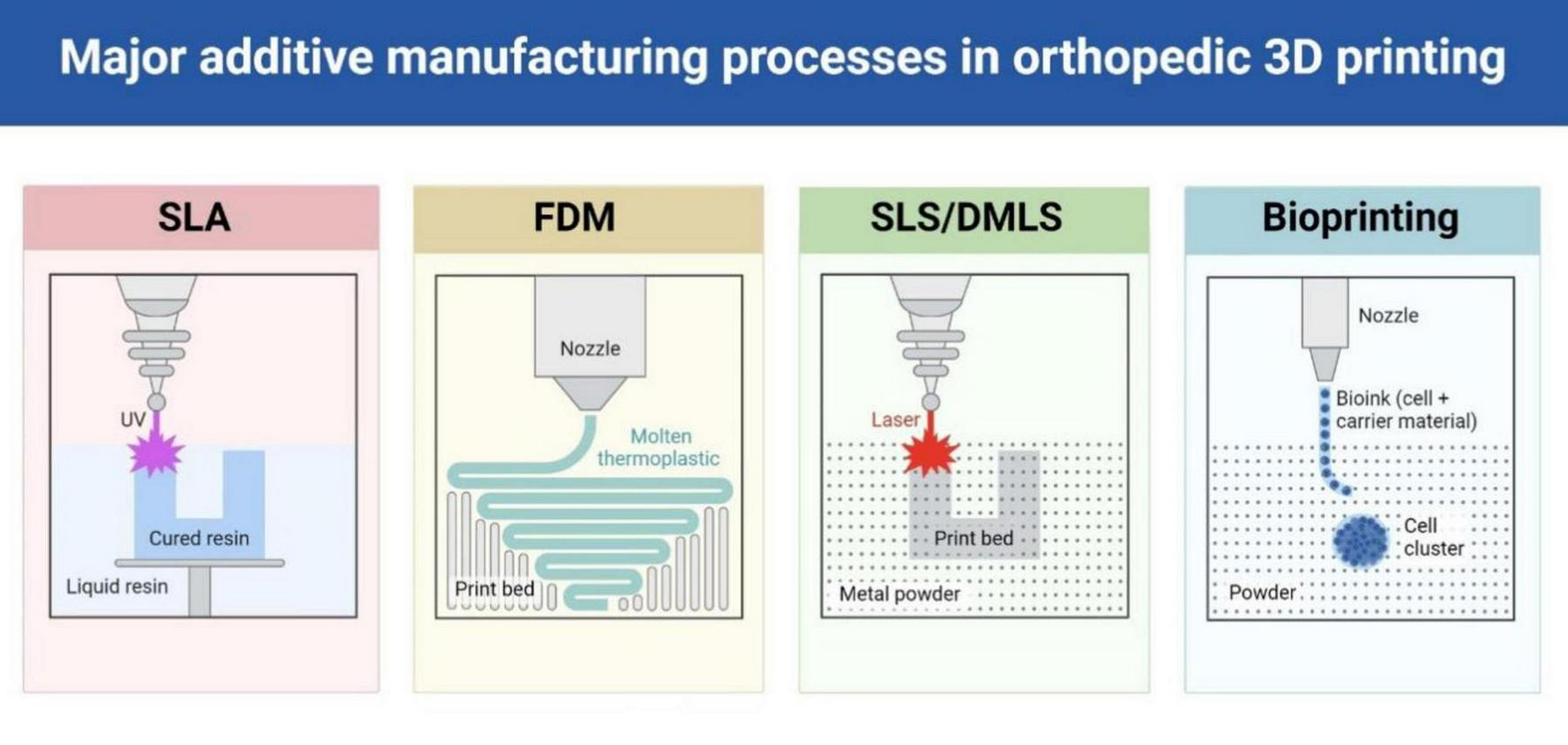 Three-dimensional printing has emerged as a transformative technology in orthopedic trauma surgery, offering unprecedented possibilities for personalized surgical solutions (10, 11). Various additive manufacturing technologies have been adapted for medical applications, each offering distinct advantages for specific clinical requirements (22) (Table 1 and Figure 3).