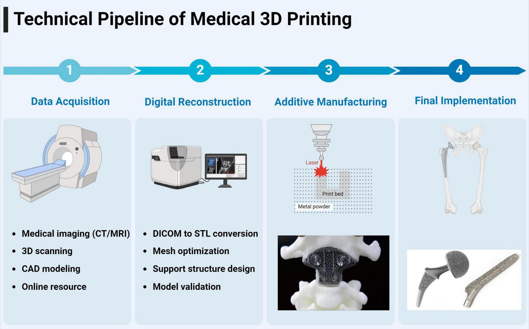 The implementation of 3D printing in medical applications requires a sophisticated digital workflow encompassing three critical phases: data acquisition, digital processing, and additive manufacturing (15). The initial phase involves obtaining digital representations through various methodologies, including computer-aided design (CAD) software for de novo creation, high-resolution optical scanning with photogrammetry capabilities, open-source repositories of pre-validated models, and most significantly in medical applications, the conversion of Digital Imaging and Communications in Medicine (DICOM) datasets from radiological examinations (16). DICOM data from CT or magnetic resonance imaging (MRI) undergoes sophisticated segmentation and reconstruction processes to generate volumetric models suitable for 3D printing.