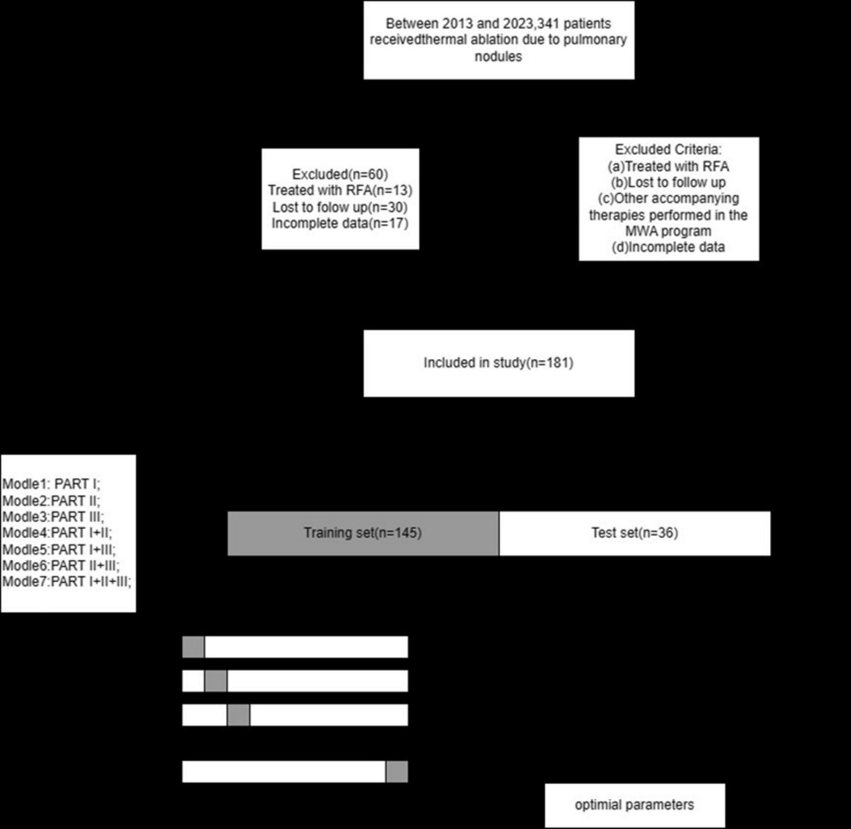 Figure 2 illustrates the selection of patients who underwent microwave ablation treatment at the Affiliated Hospital of Nantong University between May 2013 and May 2023. Patients were randomly assigned to training or validation groups in a 4:1 ratio. A total of 341 patients were included in the study, excluding 13 patients treated with radiofrequency ablation, 30 patients lost to follow-up, and 17 patients with incomplete data, resulting in the inclusion of 181 patients in the model. These 181 patients were randomly selected in a 4:1 ratio, with 145 patients included in the training group and 36 patients in the validation group. Subsequently, seven different models were constructed for the training group based on temporal graph selection criteria. Table 1 shows the selection criteria, each model underwent four machine learning ten-fold validations, and the model with the highest accuracy was selected and validated using the validation set. Figure 1 shows the validation process. Table 2 describes the baseline data of the patients, including basic characteristics and clinical information for both the training and validation set.