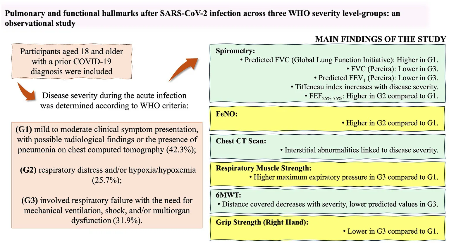 Non-invasive evaluation of the respiratory system, peripheral muscle strength, and exercise capability and tolerance can be applied in outpatient settings and provide valuable information for disease management, treatment, rehabilitation, and public health practices. Therefore, this study aimed to assess pulmonary functional and structural characteristics, along with functional capacity, in patients with mild/moderate (G1), severe (G2), and critical (G3) clinical presentations, at least 3 months after their recovery from SARS-CoV-2 infection.