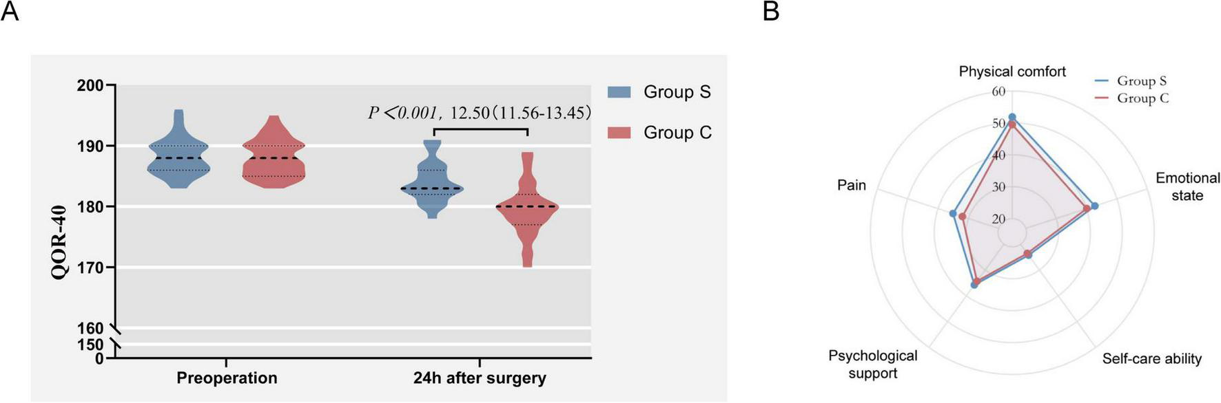 (A) The QoR-40 score of the Group S and Group C; (B) the differences of five dimensions of QoR-40.
