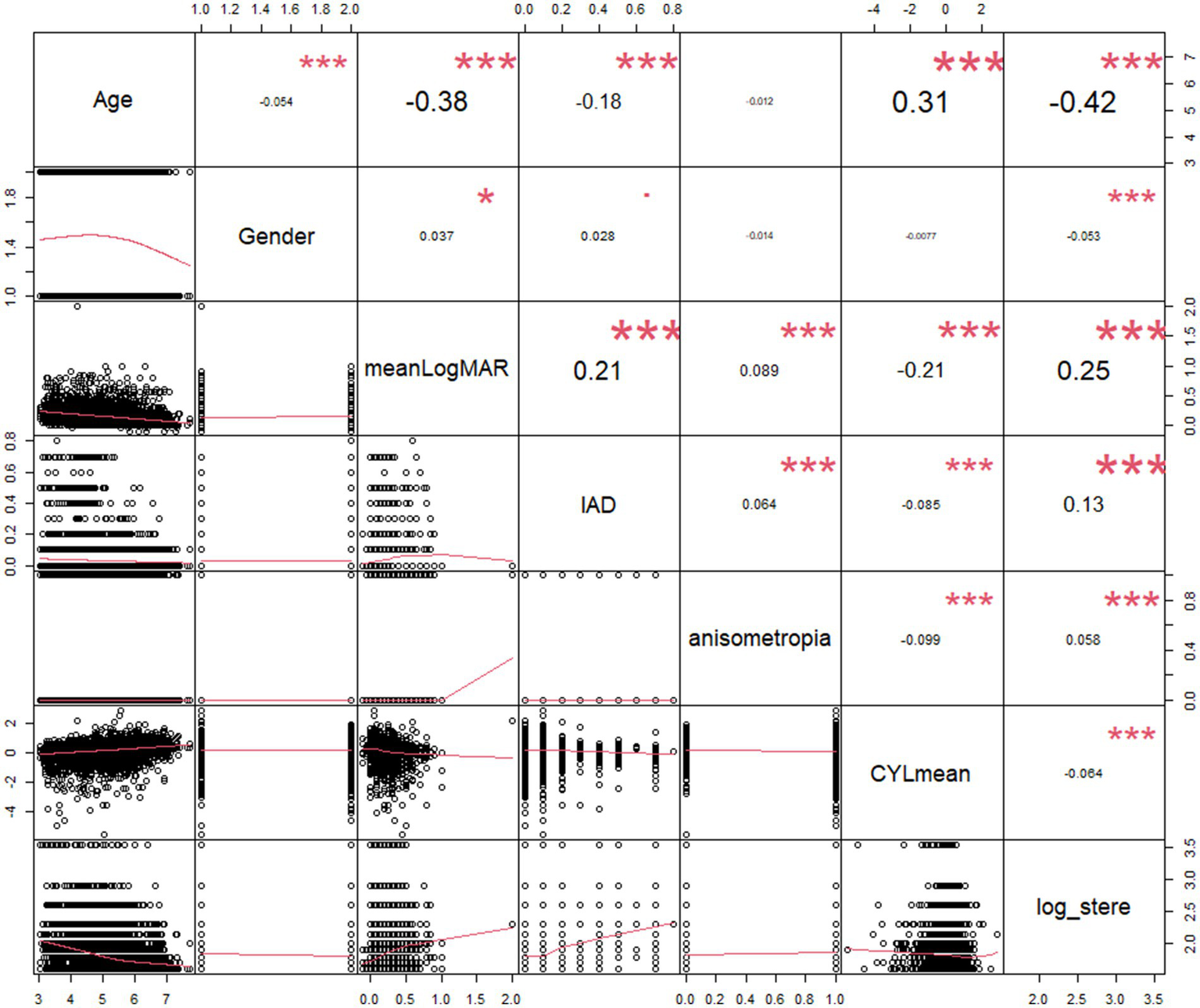 We hypothesized that the log unit of stereoacuity may be associated with age, gender, and ocular measurement of children, with ocular parameters of interocular symmetry, such as, IDSE, IDC, IDS, IAD, and strabismus, and with parameters of refractive error, including SPHmean, CYLmean, SEmean, myopia (SE < −0.50D), hyperopia (SE ≥ +2.00D), anisometropia (IDSE ≥ 1.00D or IDC ≥ 1.00D), and astigmatism (cylindrical diopter≥1.00D).