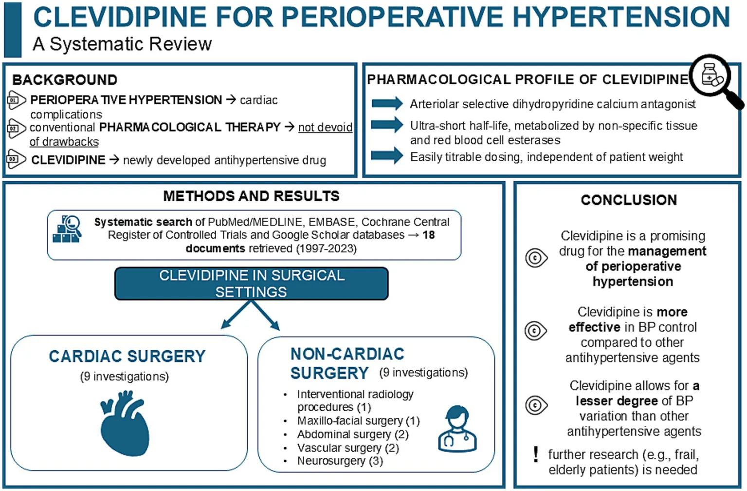 Given the promising pharmacokinetic/pharmacodynamic profile of clevidipine and its ever-increasing use as part of the daily perioperative hemodynamic management in patients experiencing perioperative hypertension, we conducted a systematic review to retrieve and summarize all the available evidence regarding its use in both the cardiac and noncardiac surgery settings. By reporting on the key features, indications, outcomes and adverse events emerging from the current body of literature, we aim to equip the practicing anesthesiologist with insightful perspectives to implement clevidipine as a part of the daily management of perioperative hypertension involving patients across several surgical settings (Graphical abstract).