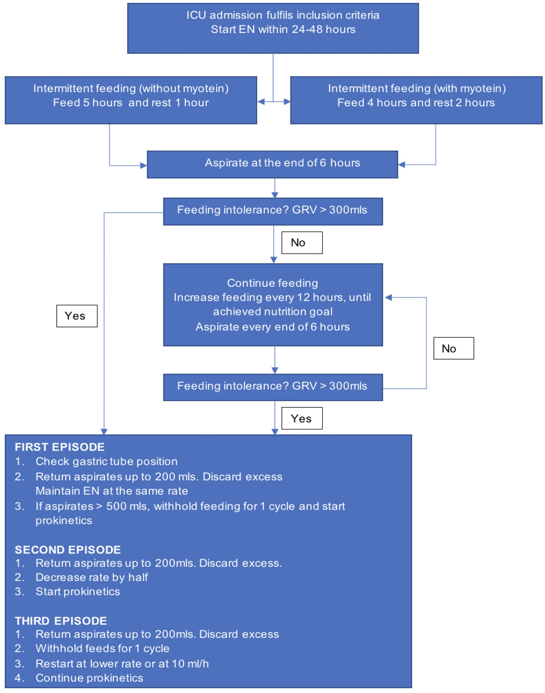 Regular training of staff who are involved in decision-making, implementation of the feeding process with the latest evidence-based feeding recommendations, and contemporary revision of existing feeding protocols are among the ways to minimize human-related FI. Our local protocol, as shown in Figure 1, was based on an intermittent feeding method that incorporated our enteral nutrition guideline (8). Despite the implementation of the enteral feeding protocol in our unit, the management of GRV, the process of increasing the rate of feeding, and the stoppage of feeding for pre-procedure differ among nurses and doctors. These contributed to interruption of feeding and delay in targeted calorie and protein intake. Therefore, in the present study, our objectives were to evaluate the effectiveness of the feeding protocol in improving the feeding interruption, nutrition adequacy, and clinical outcomes.