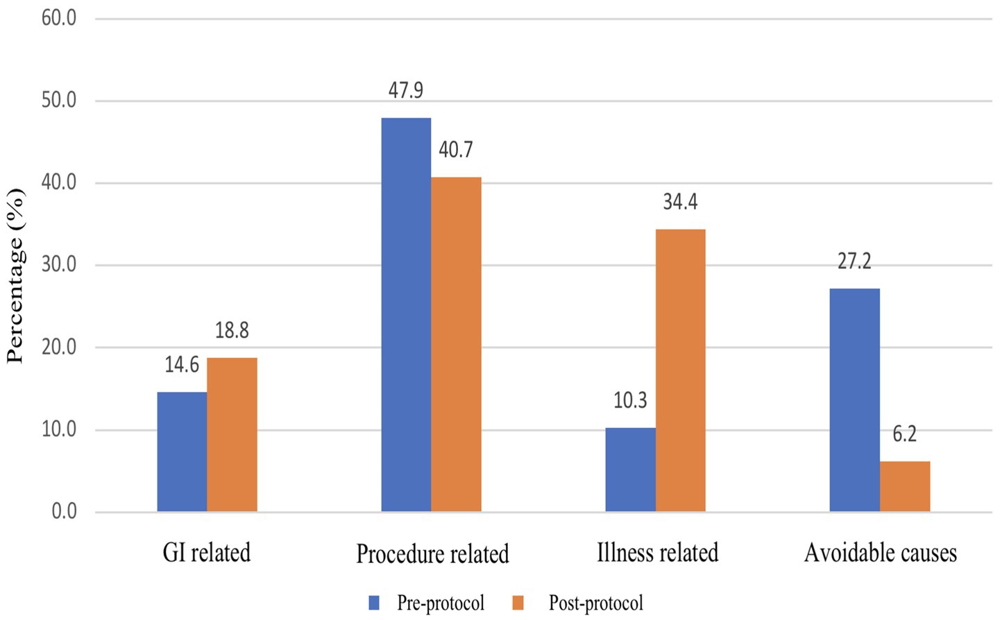 Figure 3. Prevalence of different causes of feeding interruption between pre-protocol and post-protocol groups.