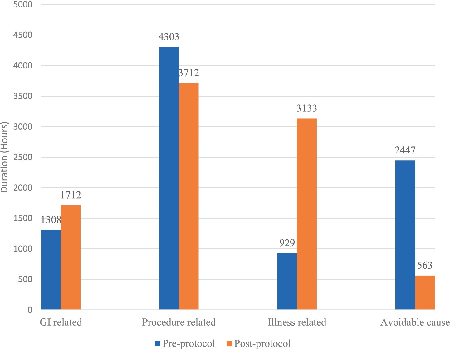Figure 4. Duration of different causes of feeding interruption between pre-protocol and post-protocol groups.