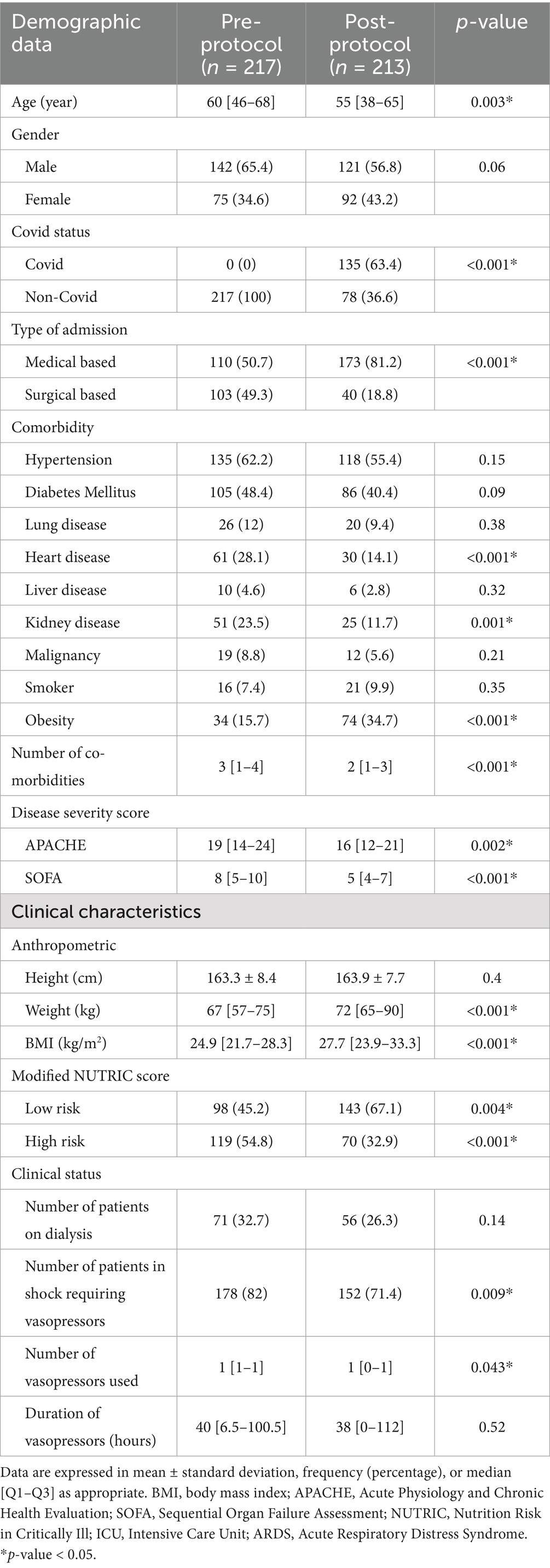Our study identified that those in the pre-protocol phase were older, had a larger risk of malnutrition, and were more ill upon ICU admission. They were also diagnosed with a greater number of concomitant co-morbidities, and the majority presented in a shock state, which could describe the higher disease severity score in the pre-protocol group. Our ICU is a mixed model that equally caters to medical and surgical admissions; however, the surge of COVID-19 cases in 2021 resulted in a significant increase in the number of available beds for critically ill COVID-19 patients, a reduction in the admission numbers for other medical and surgical patients, and the reallocation of these critically ill patients to other critical care areas. This shift in the patient’s profile contributed to the observed demographic differences. Obesity was detected in 70.7% of our COVID-19 patients. Zhang et al. (35) demonstrated that obesity was associated with an increased likelihood of presenting with severe COVID-19, developing ARDS, and admission into the intensive care unit, which could explain the significant proportion of COVID-19 patients with obesity and ARDS status upon ICU admission in the post-protocol group. Despite these baseline imbalances, subgroup analysis within the intergroup demonstrated that factors such as APACHE II score, admission type, and NUTRIC score were not associated with nutritional adequacy. To further assess the robustness of the results, multivariable linear regression analysis was conducted to evaluate the association between protocol implementation and nutritional outcomes. This approach was essential to reduce the bias in the interpretation of the protocol’s effect. After adjustment, protocol implementation remained significantly associated with earlier initiation of EN, an increase in nutritional adequacy, and reductions in both FI duration and energy deficit. Overall, these findings highlight that the observed improvements in nutritional characteristics could be attributable to the protocol, rather than due to differences in baseline characteristics, supporting the positive impact of structured and protocolized nutrition delivery, even in complex and evolving ICU populations.