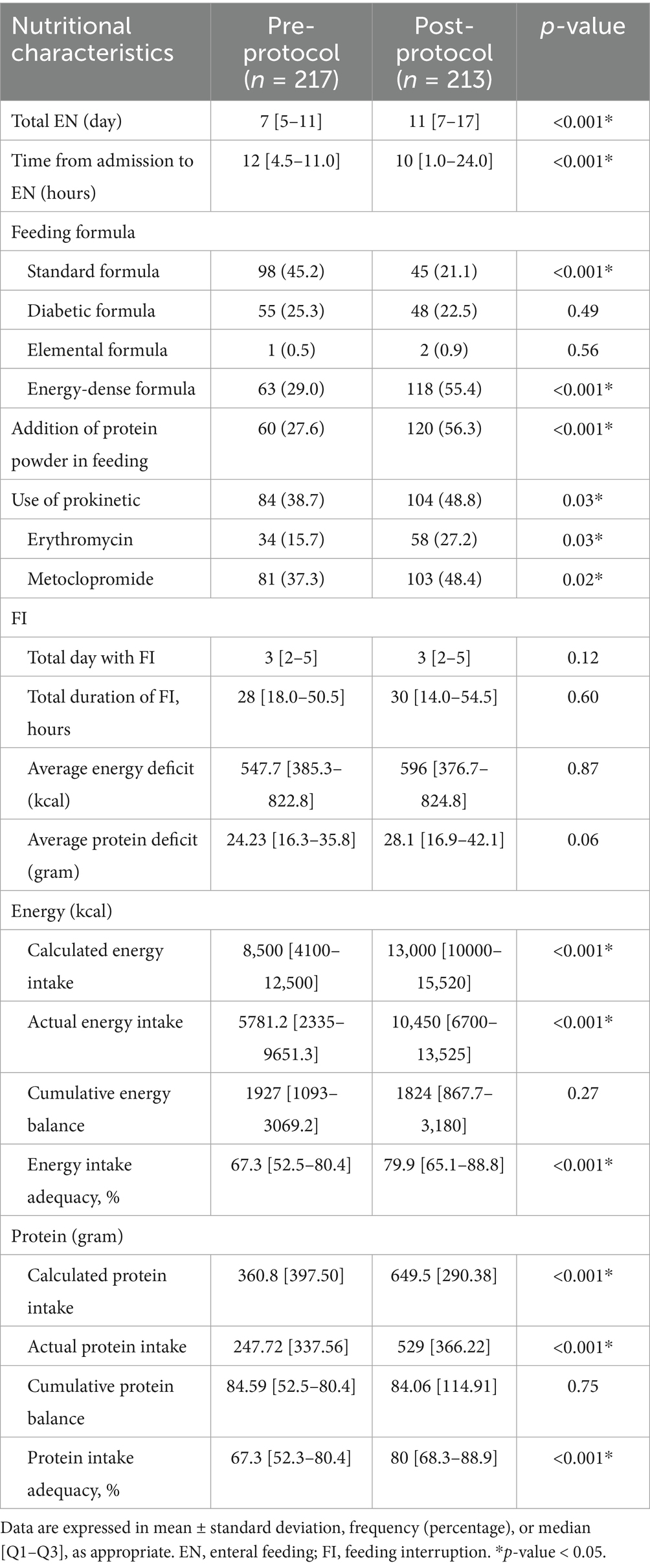 The summary of the nutritional characteristics is shown in Table 2. The total evaluable EN days were 3,670 days, with a median of 7 [5–11] days pre-protocol and 11 [7–17] days post-protocol, p-value < 0.001. Enteral feeding was initiated earlier after implementation of the protocol. A total of 71.9% of patients in pre-protocol received their first feeding within 24 h of ICU admission in comparison with 79.8% of patients, p-value = 0.011. The preference for types of EN formula administered had significantly changed from the standard formula in the pre-protocol group to the energy-dense formula after implementation of the protocol. A larger number of post-protocol patients received extra protein in the feeding. The use of prokinetic agents was also increased in the post-protocol group.