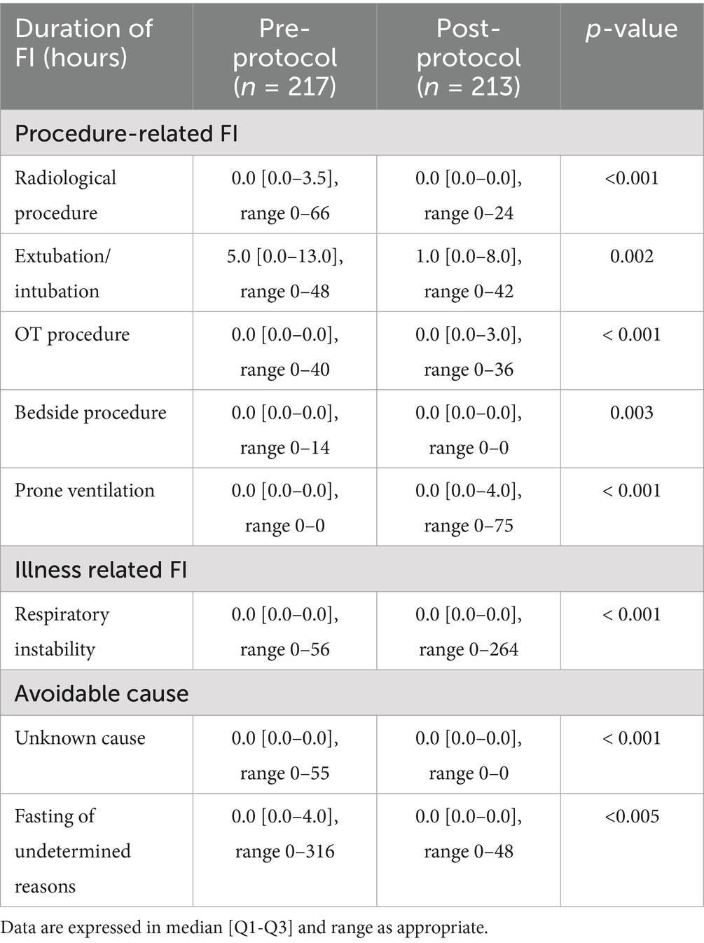 For procedure-related FI, which includes radiological, extubation and intubation, OT, and bedside procedure, the duration was significantly shorter in the post-protocol than the pre-protocol group. The duration of fasting and the unknown cause of FI were also significantly less in the post-protocol group. Prone ventilation and the duration of FI as a result of respiratory instability were significantly longer in the post-protocol group in comparison with the pre-protocol group, as shown in Table 3. The subgroup analysis of FI duration related to hemodynamic instability and GI, which includes FI due to vomiting, diarrhea, high gastric aspirate, and GI bleeding, was comparable between groups.