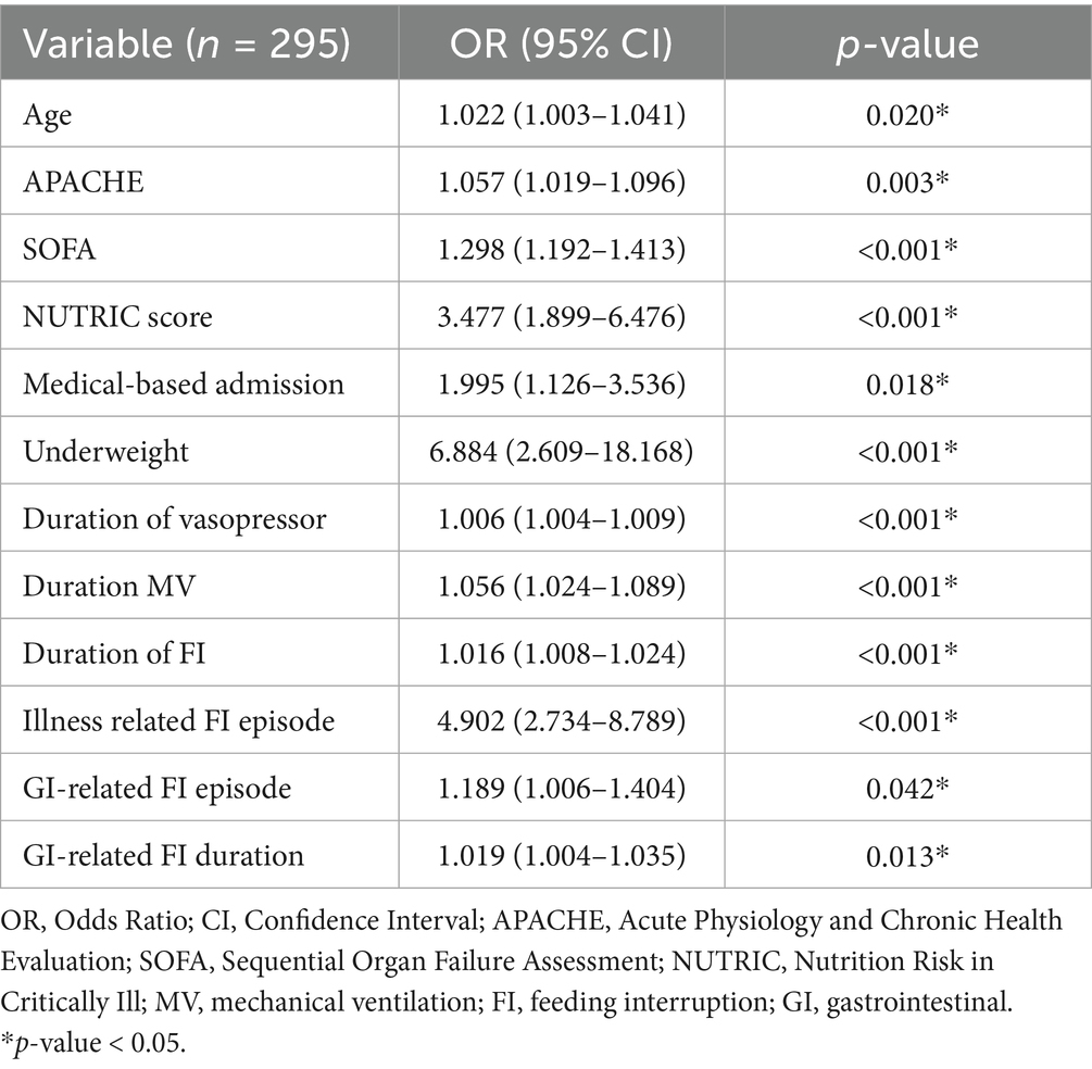 We used Spearman’s Rank Order Correlation test to measure the strength and direction of association between the duration of feeding interruption and ICU outcomes. The correlation strength was described as weak when the absolute value was below 0.50, moderate between 0.50 and 0.75, and strong with a value above 0.75. Logistic regression analysis was performed to identify the independent predictors of clinical outcome, which includes duration of ICU stays, mechanical ventilation, and ICU mortality. All the risk factors and other relevant variables with a p-value less than 0.2 in univariate analysis were entered stepwise into a multi-logistic regression model. The coupling variables were added and removed with a stepwise approach to obtain the final optimal model for factors predicting ICU mortality. A two-sided p-value of 0.05 or less was considered statistically significant.