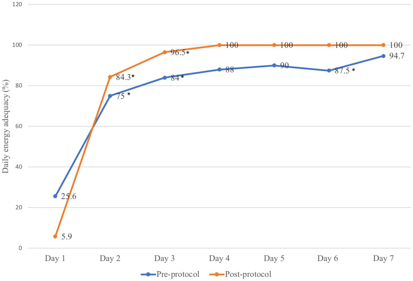 Figure 2. Daily energy adequacy provided before and after implementation of the feeding protocol. *p-value < 0.05.