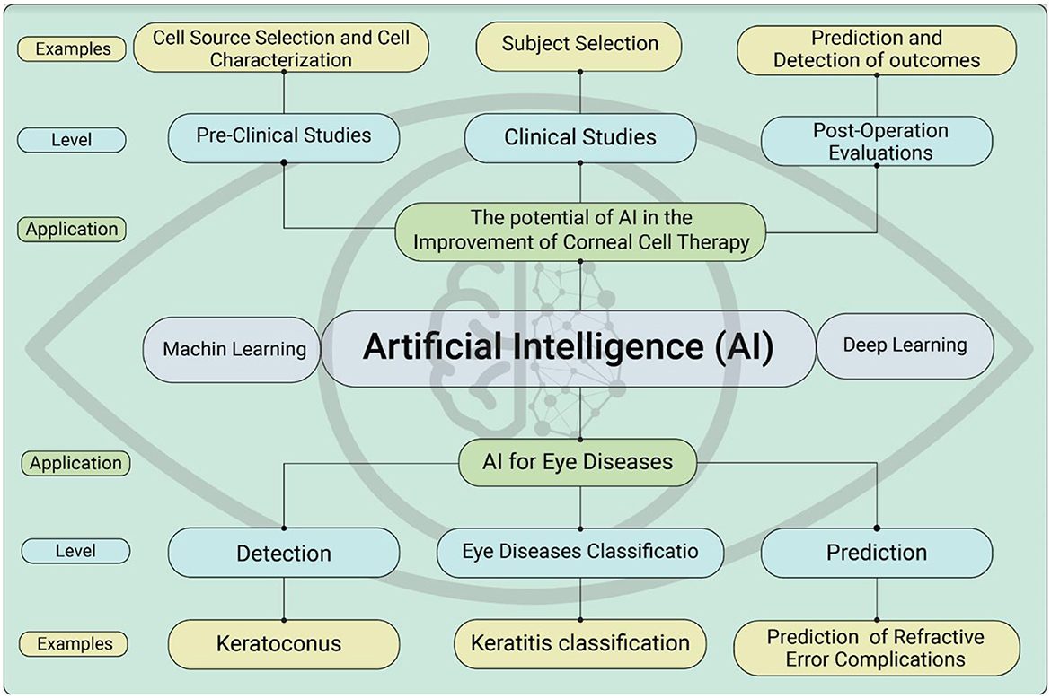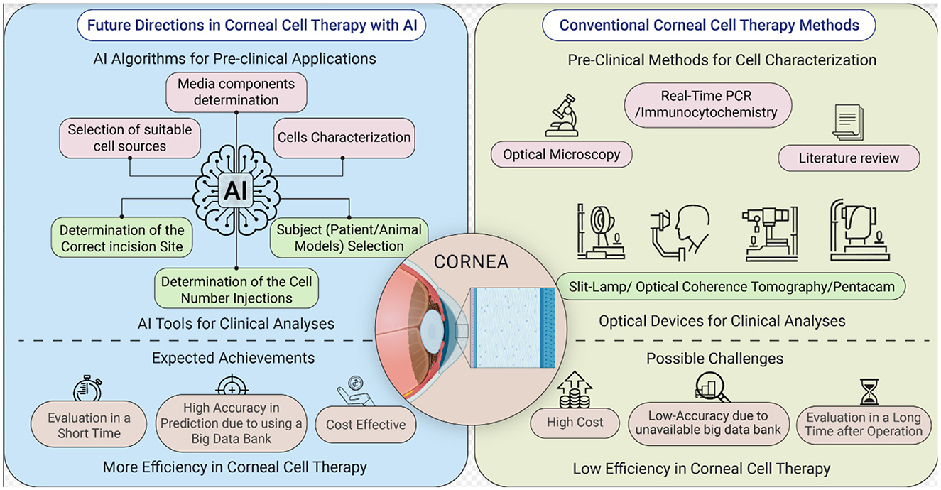 Cell therapy is an emerging medical field that utilizes living cells to address a range of diseases and problems. AI has the potential to speed up the development of cell therapy by supplying insights, forecasts, and optimizations at various stages. For example, AI can help identify new targets for cell treatment by examining extensive genomic, transcriptomic, and proteomic data, and patient-specific details. Using biological and clinical factors, AI can assist in determining the most relevant and achievable targets. Computer algorithms can assist in optimizing the design of cell therapy payloads, including genetic modifications, receptors, and signaling pathways that ensure a cell's functionality and selectivity. AI-based approaches can explore and utilize the extensive design possibilities offered by these modalities, saving time and reducing experimentation costs. Despite ongoing challenges—such as limited and variable data quality, model interpretability and validation hurdles, and ethical considerations—effective use of AI for cell therapy requires robust cross-disciplinary and cross-sector collaboration and dialogue (18, 110, 111). One of the most significant challenges in applying AI is algorithmic bias. Intrinsic biases can emerge during development and clinical deployment, leading to inaccuracies and variability in model outputs. Pinpointing the sources of bias—whether from data sampling, labeling, feature selection, model design, or deployment context—is difficult. If unaddressed, biased AI can drive non-standard clinical decisions and exacerbate healthcare disparities (112, 113). Moreover, the absence of comprehensive and sufficient regulations for overseeing AI development and usage, along with concerns about data safety and transparency, are significant challenges that require special attention (114, 115). Optimized treatment scenarios using AI may be more realistic by encompassing a single treatment option or determining the most effective combination of treatments. For instance, it would be attractive for treatments to be accompanied by an accurately prescribed dosage, which plays a crucial role in evaluating individual therapeutic methods. Employing AI algorithms for personalized corneal cell-based therapies can effectively aid in administering sufficient cell numbers to patients. The exact cell injection location in keratoconic corneas may be detected by AI algorithms. Therefore, these patients might receive sufficient cells at optimized location for improving vision.