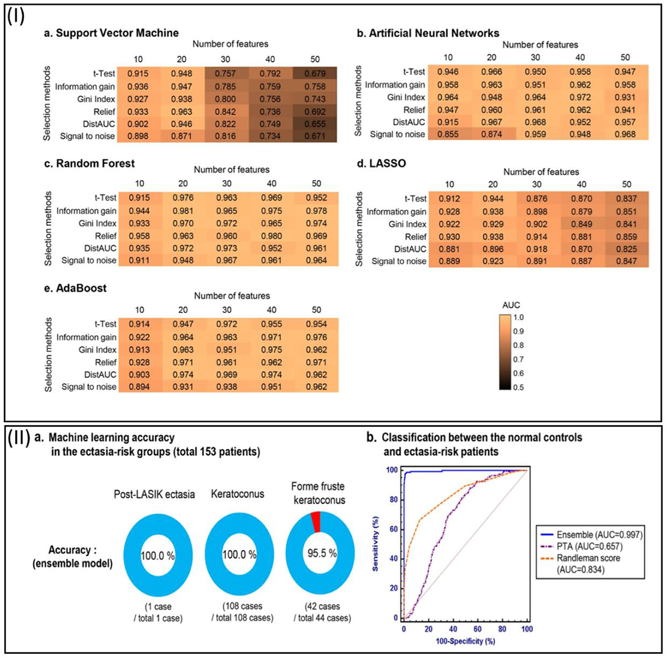 Figure 3. (I) To predict potential candidates for corneal refractive surgery, the heatmaps show the predictive performance (AUC) of feature selection and machine learning approaches. In this figure, the results of 10 fold cross-validation are indicated. a: Support vector machine. b: Artificial neural networks. c: Random forest. d: Least absolute shrinkage and selection operator (LASSO). AdaBoost. (II) Machine learning techniques are assessed for identifying ectasia-risk categories, including post-LASIK ectasia, keratoconus, and forme fruste keratoconus patients. a: Each group at risk of ectasia in an accuracy rate. b: ROC curves to classify the normal control (N = 9,556) and total ectasia-risk group (N = 153) (50).