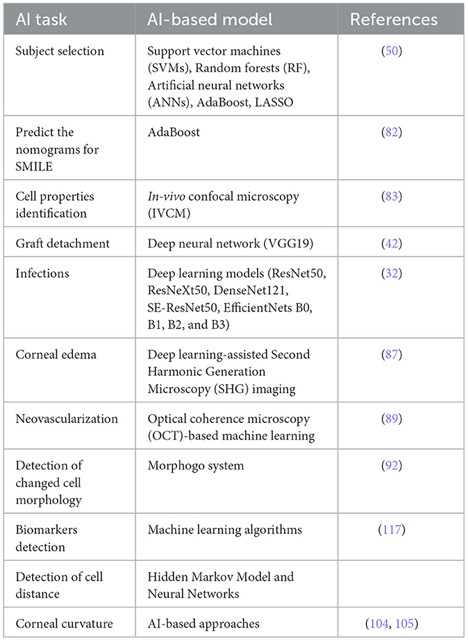 The process of diagnosing and planning treatment in the field of ophthalmology relies significantly on clinical examination and advanced imaging techniques. Slit-lamp photography, optical coherence tomography (OCT), tomography, and in vivo confocal microscopy (IVCM) are all commonly used to diagnose and monitor anterior segment diseases. However, it is important to understand that these procedures can be time-intensive and may also be susceptible to potential human errors (46). The current machine learning approach successfully categorized corneal data captured with a Pentacam to identify keratoconus (47). Patients undergoing refractive surgery can be reliably classified into stable cases and clinical ectasia using a random forest (RF) model trained on Pentacam measurement data (48). A previous study forecasted the occurrence of various ocular disorders for training and validating AI-based machine learning methodologies (49). Various images depicting eye diseases such as diabetic macular edema (DME) and choroidal neovascularization (CNV), glaucoma, normal conditions, and cataracts have been employed. The study employed various deep transfer learning approaches, including basic convolutional neural networks (CNN), deep CNN, AlexNet 2, Xception, Inception V3, ResNet 50, and DenseNet121. The obtained simulation results confirmed that the ResNet50 model achieved a validation accuracy of 98.9%, surpassing the performance of all alternative methodologies. Furthermore, the Xception model exhibited commendable performance, attaining an accurate rate of 98.4%. Despite the implementation of standardized pre-operative screening, the identification of eyes at risk of developing procedure-induced ectasia remains a considerable challenge. Furthermore, there is a development of AI platforms to screen individuals with a heightened risk of post-LASIK ectasia and vision impairment. Yoo et al. developed a machine learning platform to aid the clinical decision-making for refractive surgery (50). Another investigation was conducted to develop deep learning models to predict the post-operative outcomes of SMILE surgery, such as visual acuity and intraoperative complications, based on surgical videos or images (51). In a recent review, the integration of deep learning with advanced imaging and liquid biopsy biomarkers is highlighted as a transformative approach for understanding ocular aging and its implications for systemic health (52).