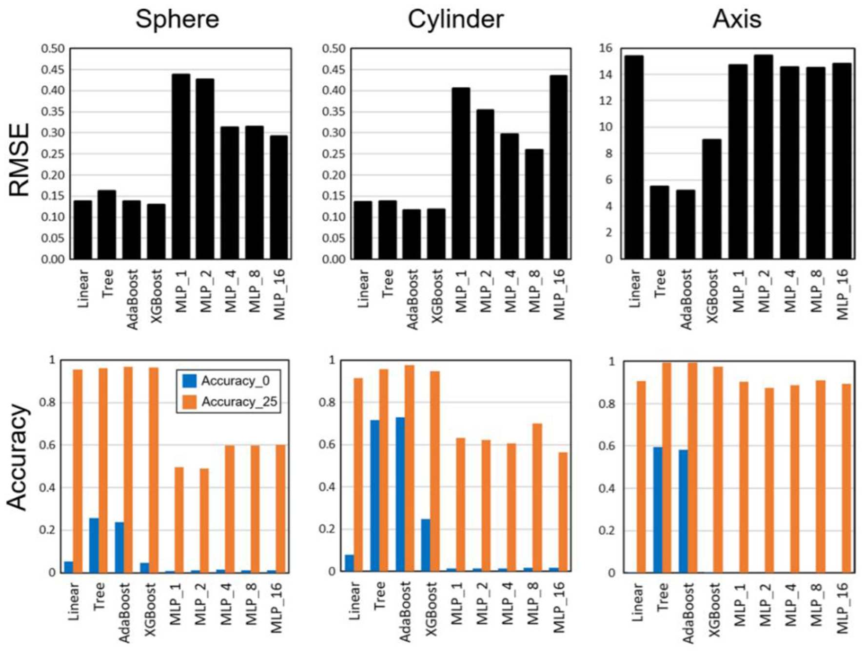 Root-mean-square errors (RMSEs) and accuracy results for multiple linear regression, decision tree, AdaBoost, XGBoost, and multi-layer perceptron (MLP) with hidden layers [Reprinted from reference (82)].
