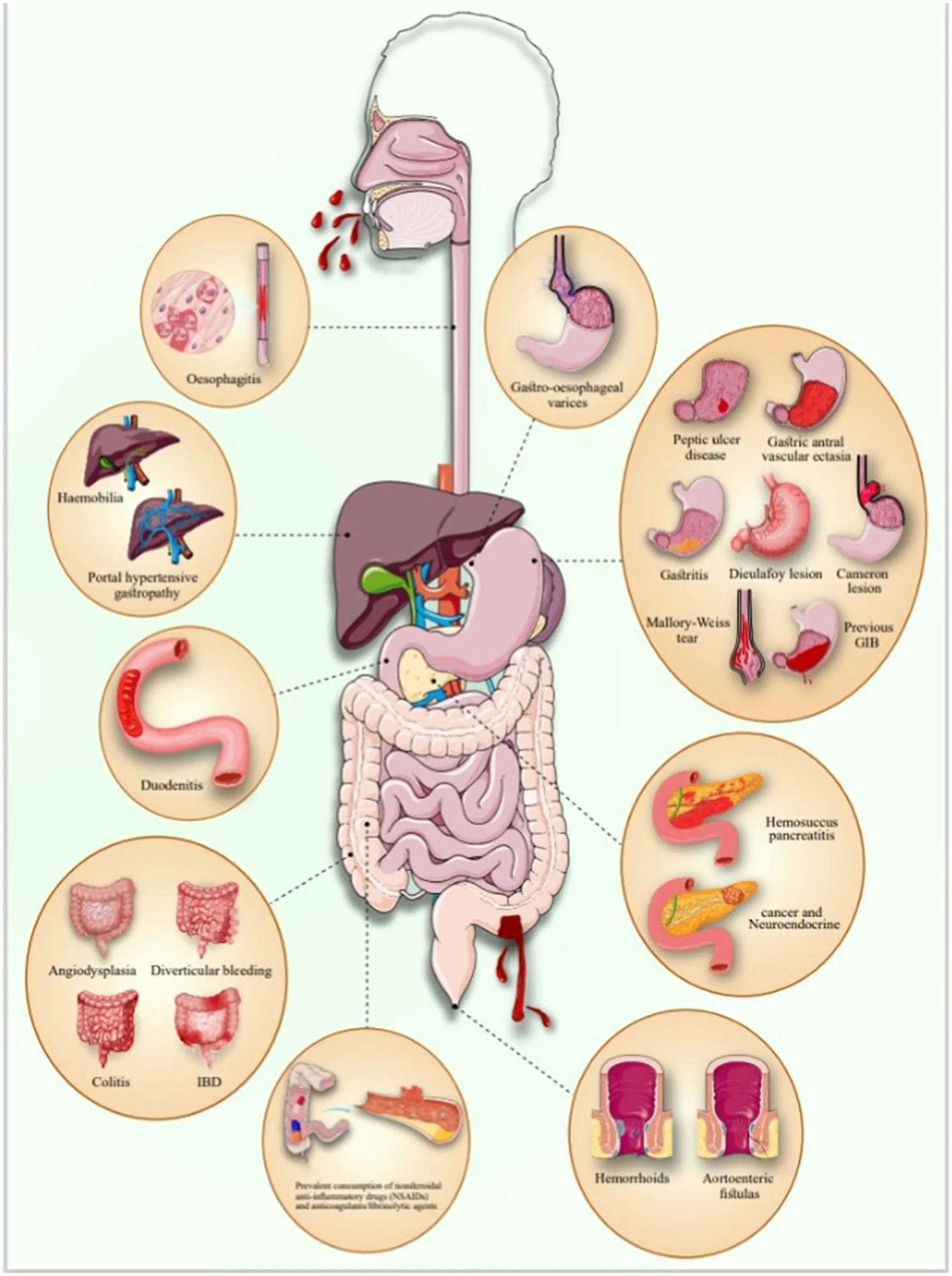 GIB refers to any bleeding that originates in the gastrointestinal (GI) tract, which includes the esophagus, stomach, small intestine, large intestine, rectum, and anus. GIB based on the Treitz ligament is divided into UGIB and LGIB (1). GIB can result from a variety of underlying conditions affecting the entire digestive tract, from the esophagus to the anus. Common causes of UGIB include peptic ulcer disease (PUD), esophageal varices, Mallory-Weiss tears, tumors, angiodysplasia, and the use of medications such as non-steroidal anti-inflammatory drugs (NSAIDs) and anticoagulants. In contrast, LGIB may arise from hemorrhoids, diverticulitis, anal fissures, inflammatory bowel disease (IBD), colon polyps, and colorectal cancers. Identifying the root causes is crucial for effective management and treatment of GIB (2).