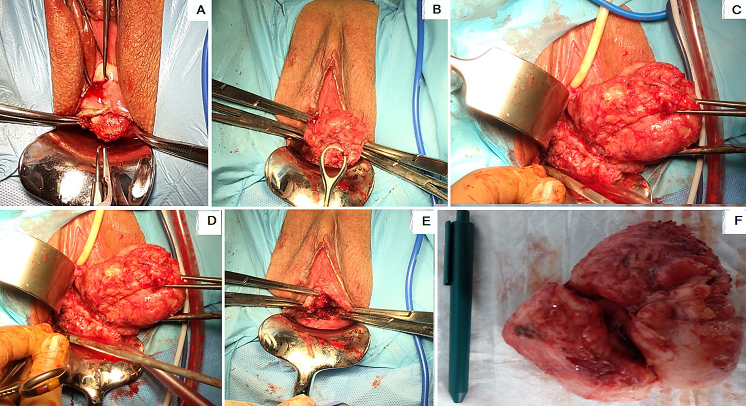 Steps of the cervical intracapsular myomectomy: (A) The protrusion of the uterine cervical fibroid (CF) lower portion; (B) hooked and pulled CF by the ring forceps; (C) coagulation of the CF pseudocapsule fibro-neurovascular fiber; (D) the CF hooked and pulled up with Collin’s forceps; (E) uterine cervix after CF removal; (F) the removed CF placed next to a pen.