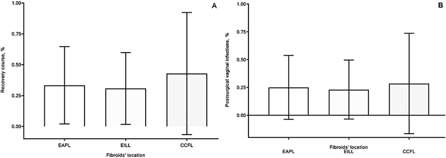 Recovery course [(A) %] and postsurgical minor local complications [(B) %] of patients in group 1 with extracervical anterior–posterior localizations (EAPL), group 2 with extra- and intracervical lateral localizations (EILL), group 3 with combined cervical fibroid localizations (CCFL) of cervical fibroids. A nonparametric Kruskal-Wallis and Dunn’s multiple comparisons tests were used and p values < 0.05 considered significant.