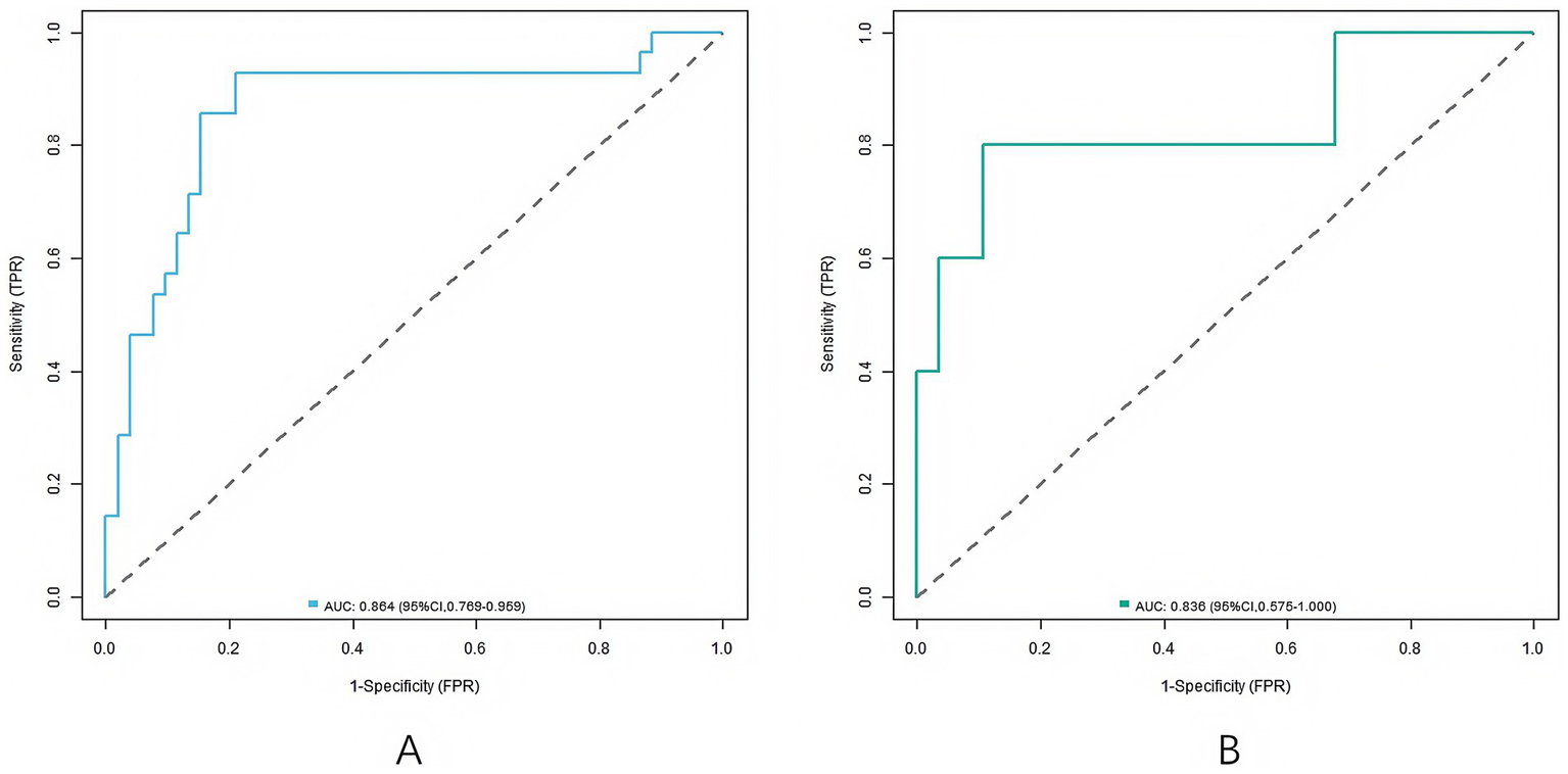 Receiver operating characteristic curves (A: the training set, B: the validation set).