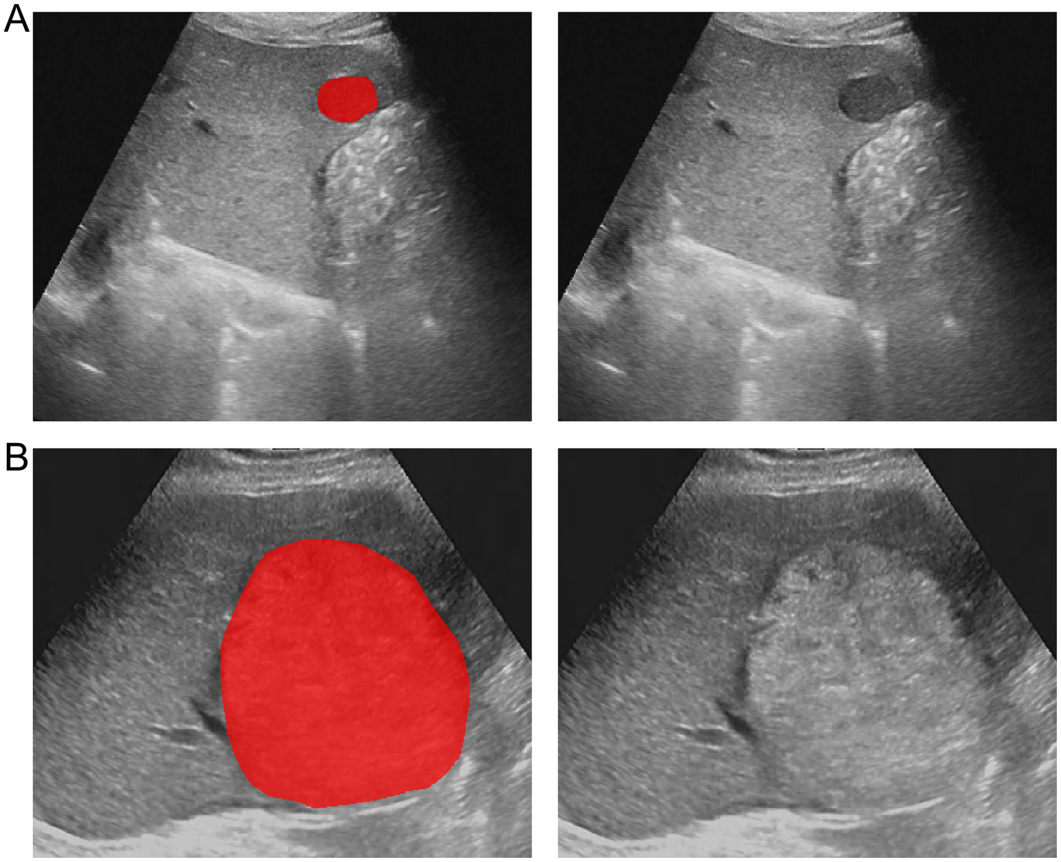 The ultrasound examination was performed following a standardized protocol. The ultrasound examination was conducted using Philips EPIQ 7, GE Vivid E9, or HIVISION Ascendus (C715; frequency range: 1–5 MHz). All patients fasted for 8 h and underwent liver ultrasound in the supine position. The maximum diameter, echo signal, and Doppler flow signal of lesions were assessed by two radiologists with 5 years of liver ultrasound experience. Both radiologists were blinded to the clinical and pathological information of the patients. The image indicating the maximum diameter of the lesion was saved in digital imaging and communications in medicine (DICOM) format for subsequent image segmentation. In total, 182 ultrasound images from 182 lesions were included for further analysis.