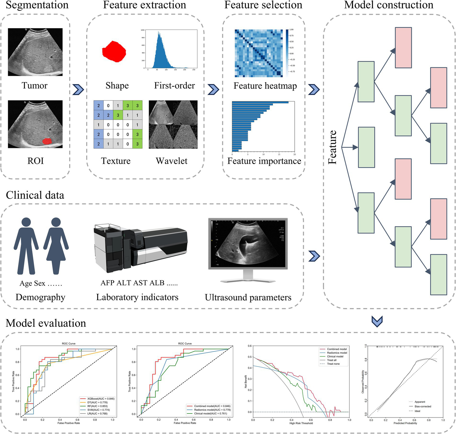 Methods: 154 HCC patients with 182 lesions from 2019 to 2024 were reviewed retrospectively. All lesions were randomly split into the training set (n = 129) and the test set (n = 53), and ultrasound radiomics features were extracted and selected. Extreme gradient boosting tree (XGBoost), decision tree (DT), random forest (RF), support vector machine (SVM), and logistic regression (LR) were used to construct the ultrasound radiomics models, the clinical models, and the combined models. The predictive performance of various models was evaluated by the area under the curve (AUC), accuracy, calibration curve, and decision curve analysis (DCA).