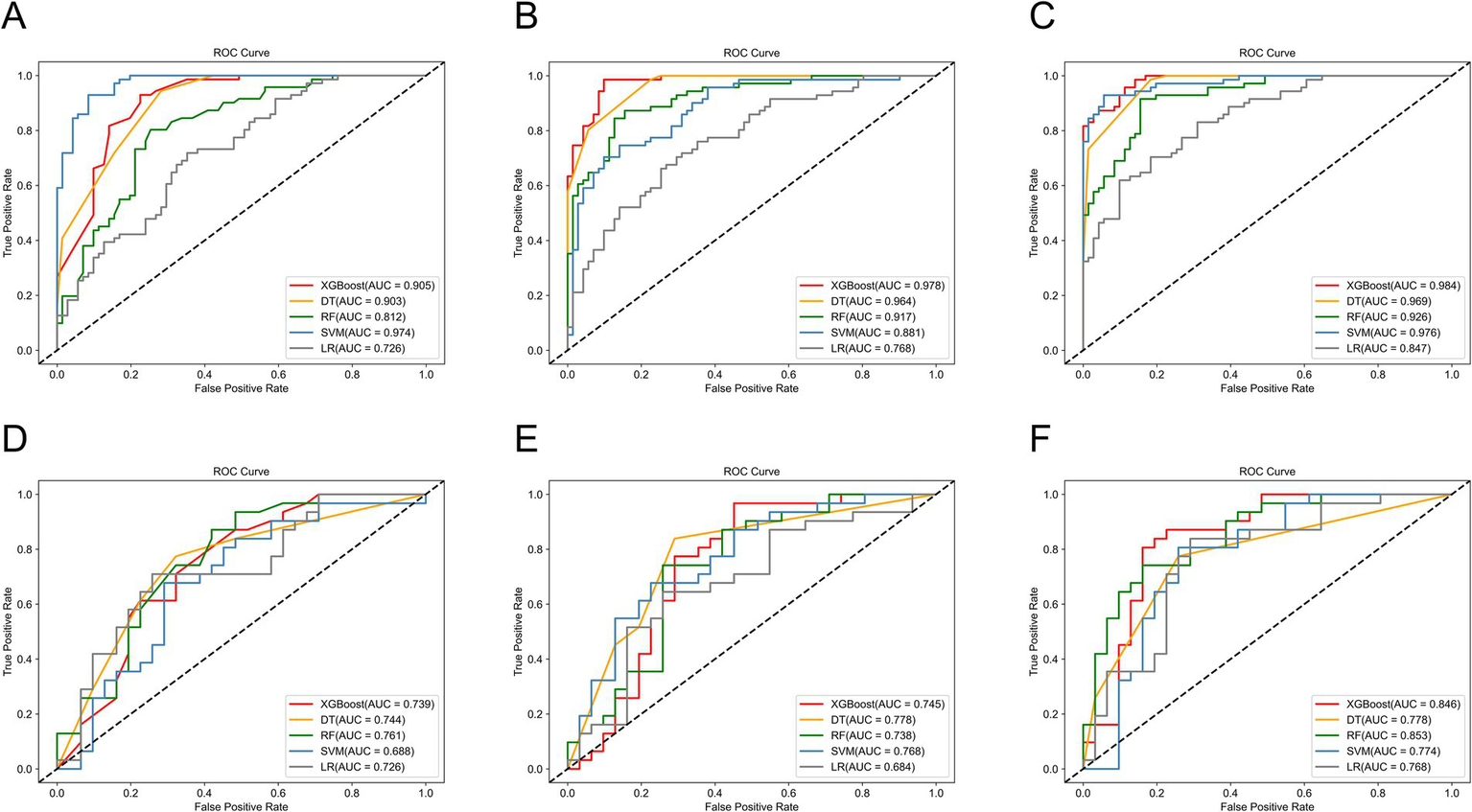 Figure 5. The ROC curves of machine learning models in the training set of (A) the clinical models, (B) the radiomics models, and (C) the combined models, and the test set of (D) the clinical models, (E) the radiomics models, and (F) the combined models.