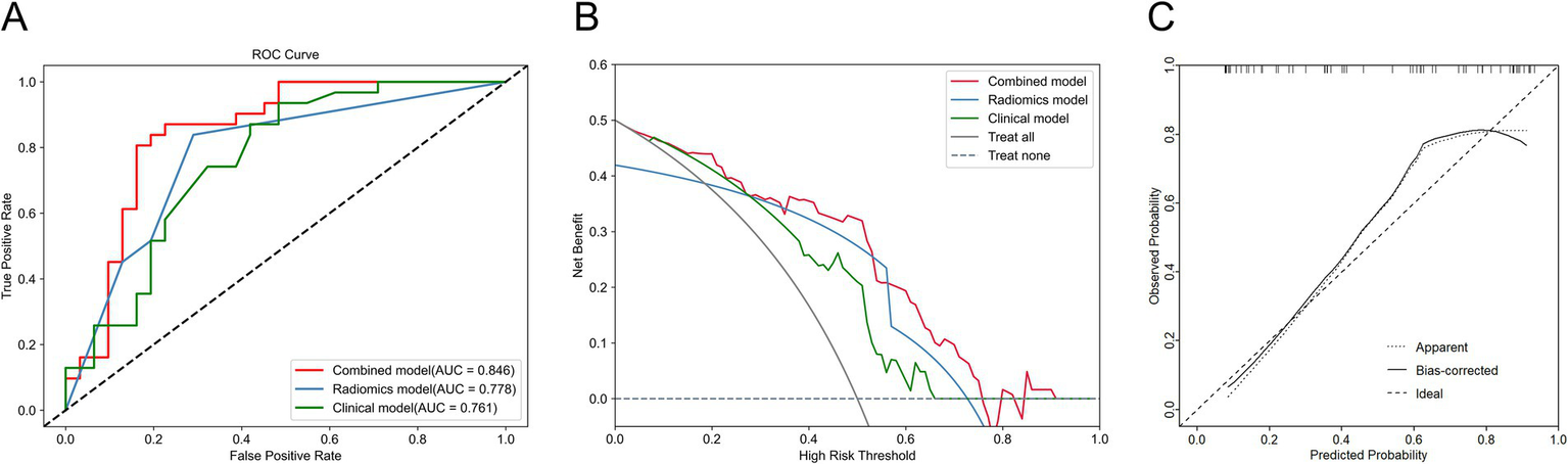 Figure 6. Comparison of the performance of three models in the test set. (A) ROC curve of three models. (B) Decision curve analysis (DCA) for three models. (C) Calibration curve of the combined model.