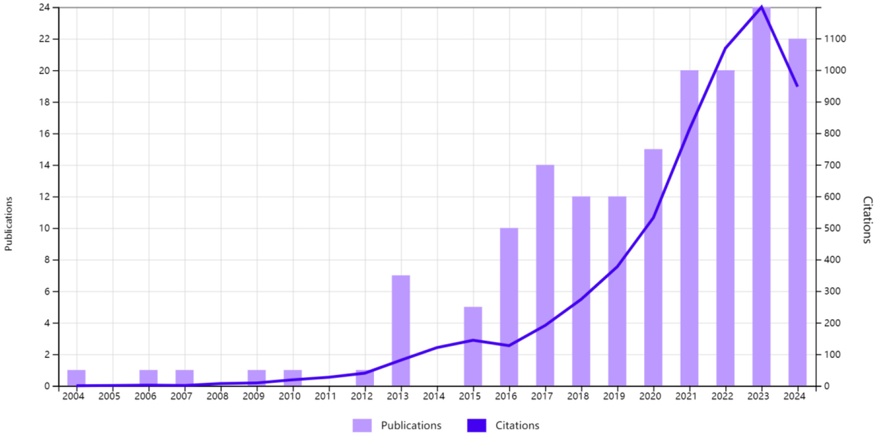 We identified 167 publications on intestinal flora and PBC published between 2004 and 2024. Of these, 68 were experimental articles and 99 were reviews. The number of citations in these articles was 5,984, with an average of 35.83 citations per article. The highest number of citations (n = 1,199) was recorded in 2023. The number of relevant publications steadily increased since 2016, which may be related to the continuous development of metabolomics and macro-genome sequencing technology. The largest number of related research articles was published in 2023, with a total of 24 articles. This trend is likely to continue growing, which also indicates that researchers' interest in the study of intestinal flora and its relationship with PBC remains strong (Figure 2).