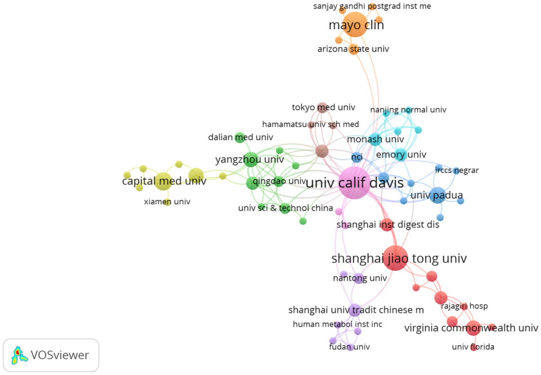 Table 2 shows the top 10 research institutions by number of publications in the field of research on intestinal flora and PBC. The institution with the largest number of publications was the University of California, Davis (United States) (n = 18); followed closely by the Mayo Clinic (United States) and Shanghai Jiao Tong University (China), each with 11; the University of Oslo (Norway) (n = 9); the University of Birmingham (United Kingdom) (n = 7); Oslo University Hospital (Norway) and Capital Medical University (China), each with 6; and the National Hospital (Norway), the University of Padua (Italy), and the University Medical Center Hamburg-Eppendorf (Germany), each with 5. North Carolina State University and Ohio State University (United States) were the two institutions with the highest average number of citations (n = 305), followed by the Albert Einstein College of Medicine (United States), Chan Zuckerberg Biohub Network (United States), Daiichi Sankyo Company, Limited (Japan), and Stanford University (United States), each with an average of 275 citations. As shown by the inter institutional cooperation network diagram generated by VOSviewer (Figure 4), research institutions in developed countries, led by the United States, work in close cooperation. Further, although there is cooperation between China and these research institutions, there is still considerable room for improvement at this level. Close cooperation between institutions can better promote the development of this field.
