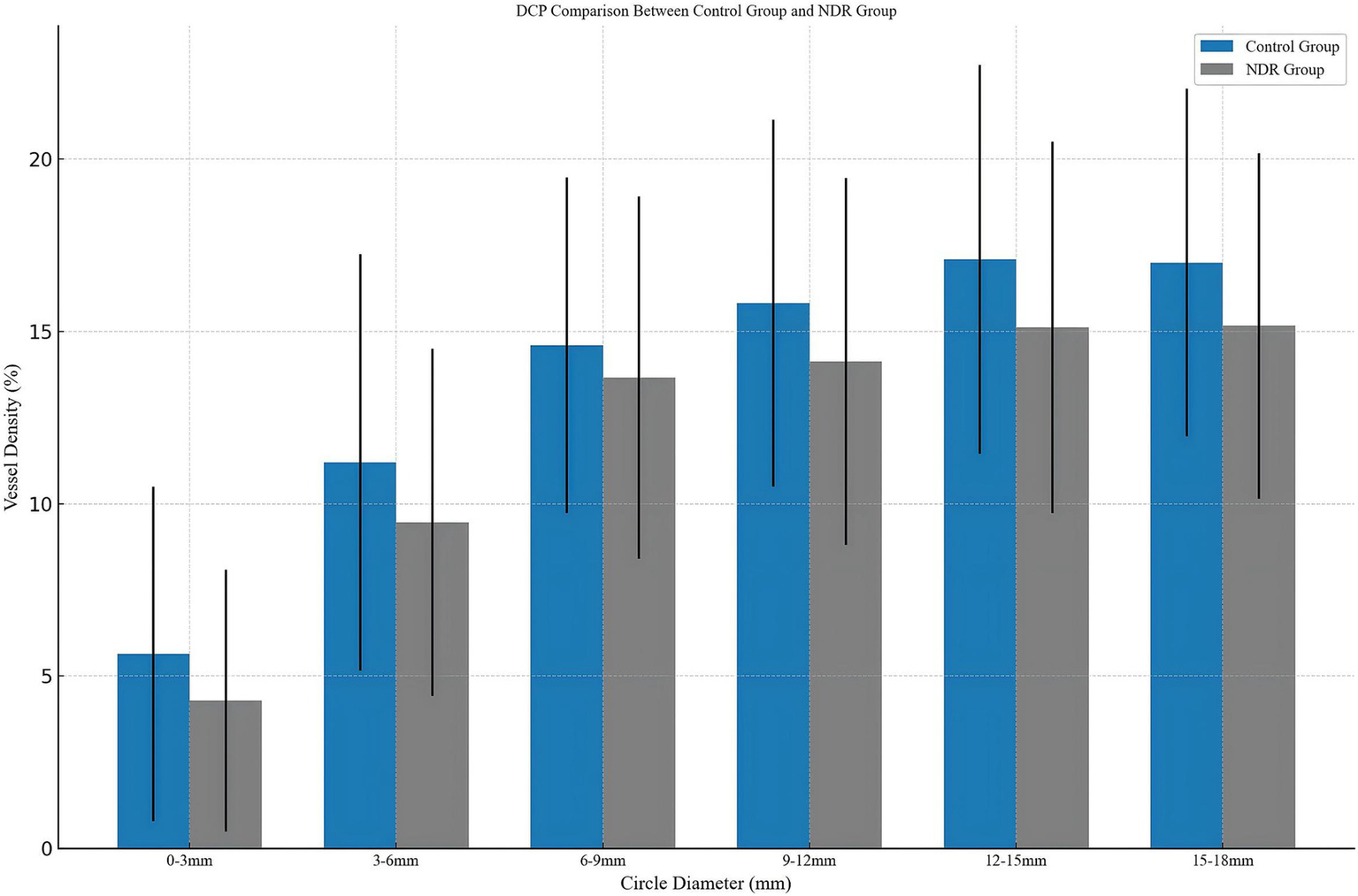 As shown in Table 2 and Figure 3, significant differences were found in the DCP, with the NDR group showing reduced perfusion in the 0–3 mm (4.29 ± 3.80 vs. 5.64 ± 4.85, p < 0.05), 3–6 mm (9.46 ± 5.04 vs. 11.20 ± 6.05, p < 0.05), 9–12 mm (14.13 ± 5.33 vs. 15.82 ± 5.33, p < 0.05), 12–15 mm (15.12 ± 5.39 vs. 17.10 ± 5.64, p < 0.05), and 15–18 mm (15.16 ± 5.02 vs. 17.00 ± 5.06, p < 0.05) regions (see Figure 3). No significant alterations were observed in SVP vessel density or choroidal parameters in patients with T2DM without clinical retinopathy across all regions (p > 0.05).