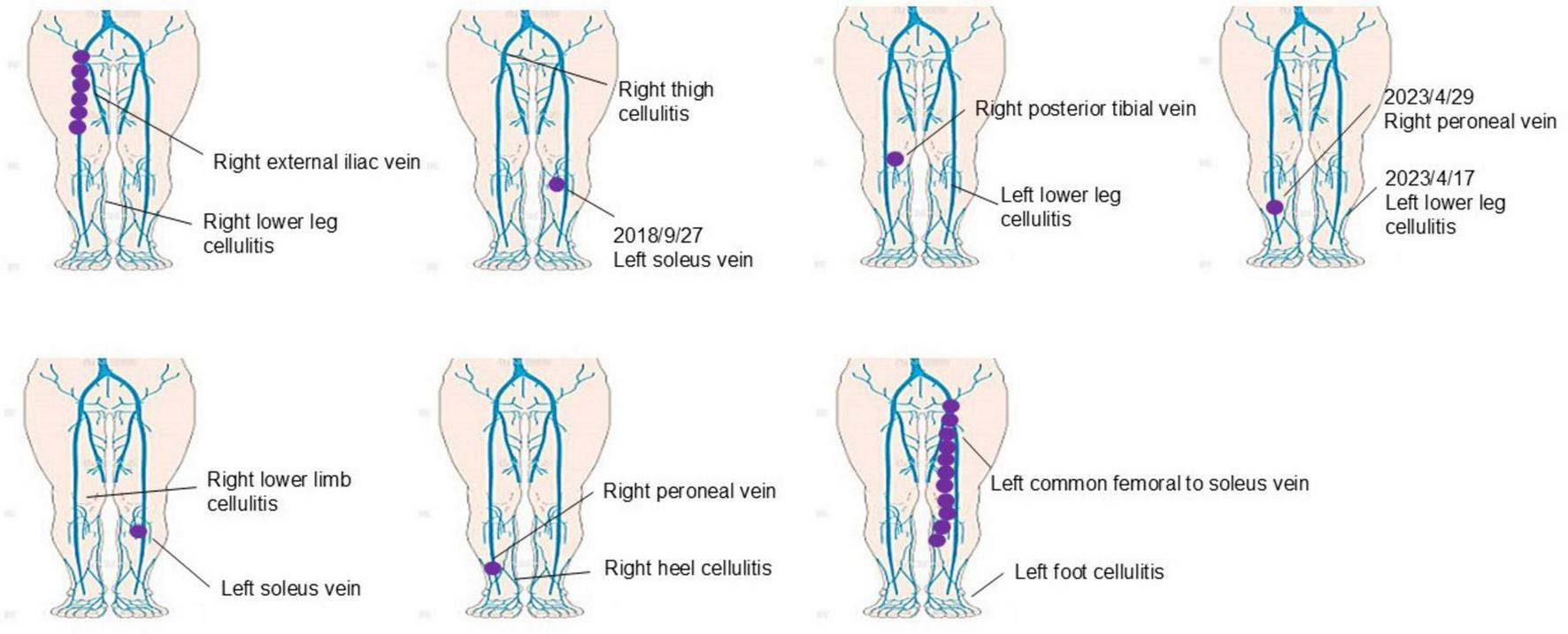 Figure 2. Case-by-case analysis of thrombosis in cellulitis patients. This figure presents a detailed case-by-case analysis of seven patients who developed thrombosis during cellulitis treatment. Thrombosis was observed in multiple venous sites, including the iliac vein (one case), peroneal vein (three cases), soleus vein (two cases), and one case involving thrombosis extending from the common femoral vein to the soleus vein. Notably, thrombosis occurred in the limb affected by cellulitis in three cases (42.9%), while four cases (57.1%) involved the contralateral limb. These findings highlight the diverse locations of thrombosis in cellulitis patients and emphasize the need for comprehensive vascular monitoring beyond the affected limb to ensure early detection and appropriate management.