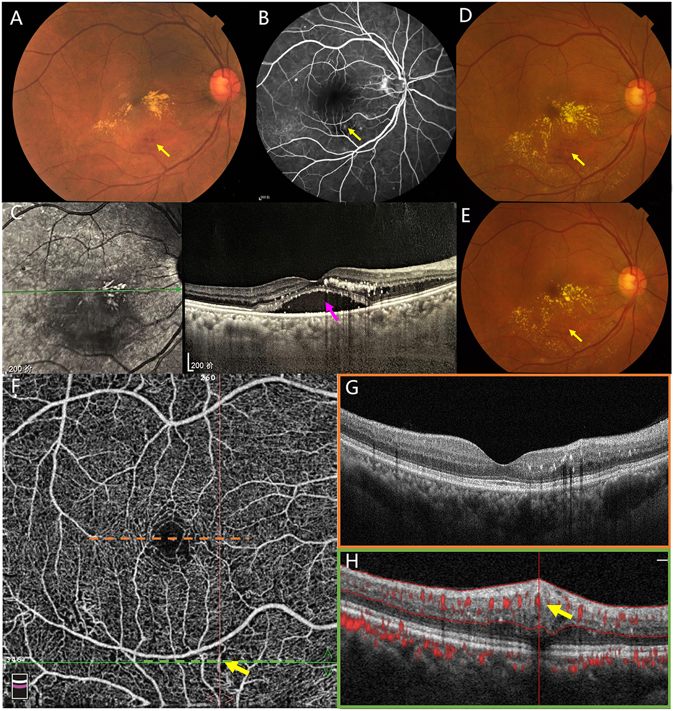 Figure 1. On initial examination, color fundus photography revealed yellowish-white hard deposits in the macular area. A suspected hemorrhagic lesion was observed inferior to the macula [(A), yellow arrow]. Fundus fluorescein angiography (FFA) demonstrated a corresponding punctate hyperfluorescent lesion at the site [(B), yellow arrow]. The remaining hyperfluorescent spots were confirmed by optical coherence tomography as small dome-shaped retinal pigment epithelial detachment (PED). Optical coherence tomography (OCT) through the fovea showed subretinal fluid (SRF, pink arrow) with dense intraretinal hard exudates (C). One month after the first intravitreal injection of conbercept, color fundus photography showed progression of hard exudates, which formed a ring centered on the original lesion (D). One month after the third intravitreal injection of conbercept, color fundus photography revealed partial resolution of the ring of hard exudates (E). Yellow arrows indicate the location of the lesion throughout the images. Optical coherence tomography angiography (OCTA) revealed an anomalous, sausage-shaped dilated blood flow signal (yellow arrow) external to the inferior vascular arcade (F). Optical coherence tomography (OCT) imaging through the fovea demonstrated complete resolution of subretinal fluid (SRF) with sparse intraretinal hard exudates [(G), orange box]. A cross-sectional OCT scan showed a vertically elliptical, tubular structure within the middle retina, characterized by a hyperreflective wall, a medium-to-low reflective lumen, and blood flow at the apical portion of the lumen [(H), green box, yellow arrow].